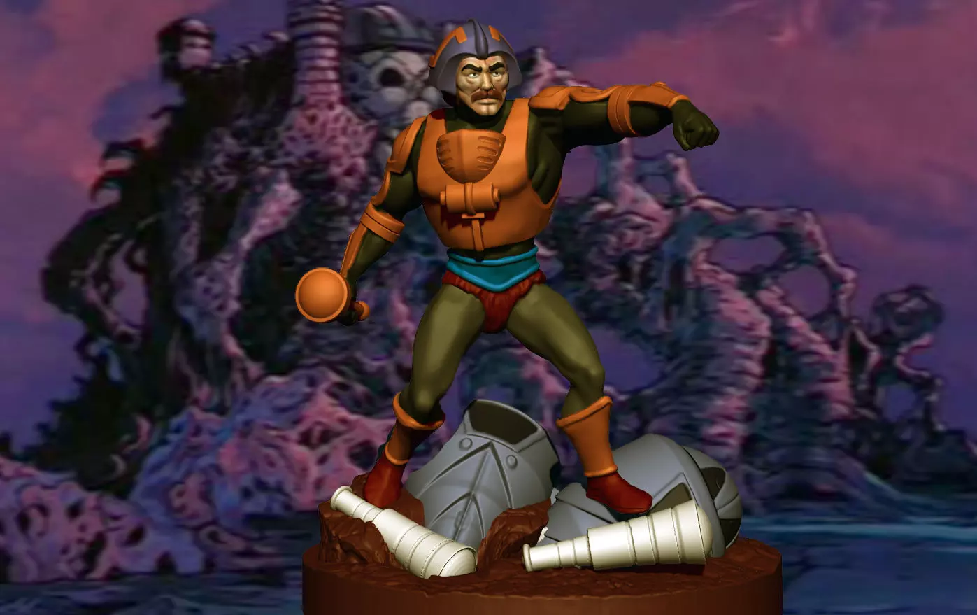 Man-At-Arms. Duncan, a loyal and trustworthy man of the royal family of Eternia, possessing the ancient knowledge of forging and machine-making, like his predecessors in the position, Man-At-Arms is vitally important to keeping the peace in Eternia, and to fight if necessary. This mission has been entrusted through generations to a single family. He is Teela's adoptive father, whom he took in as a baby at the request of the sorceress, Sorceress, his real mother. Man-At-Arms never shy away from combat and is always ready to help He-Man to defend Eternia from evil. In the early minicomics Man-At-Arms is portrayed somewhat differently. His appearance is more in line with the toy, and as there was no royal family yet there is no mention of them. In the first minicomic there is also no mention of his relationship to Teela, who is instead portrayed as a 'warrior goddess'.