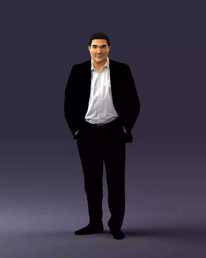A highly detailed 3D printable figurine of a man in a suit, accurately captured via 3D scanning technology. The figure presents a natural standing pose with hands in pockets, making it suitable for architectural scale models, dioramas, collectible figures, or educational displays.