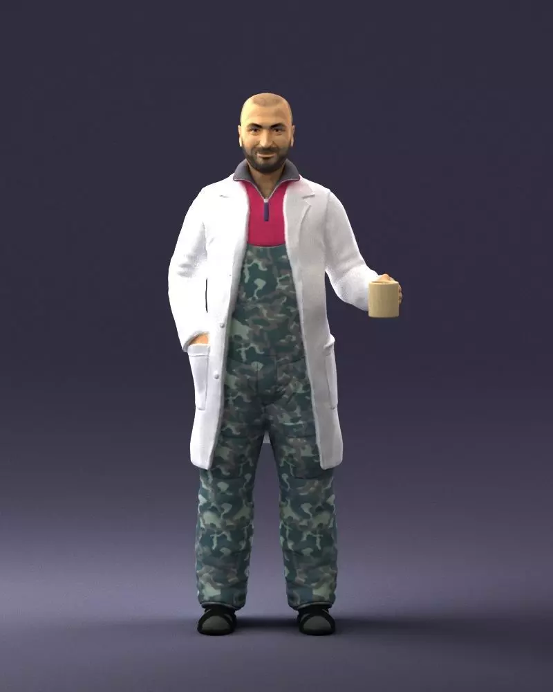 Its combination of a lab coat, camouflage overalls, and a coffee mug makes it perfect for: DioramasIndustrial facility layouts Educational models Scale environments and architectural placements