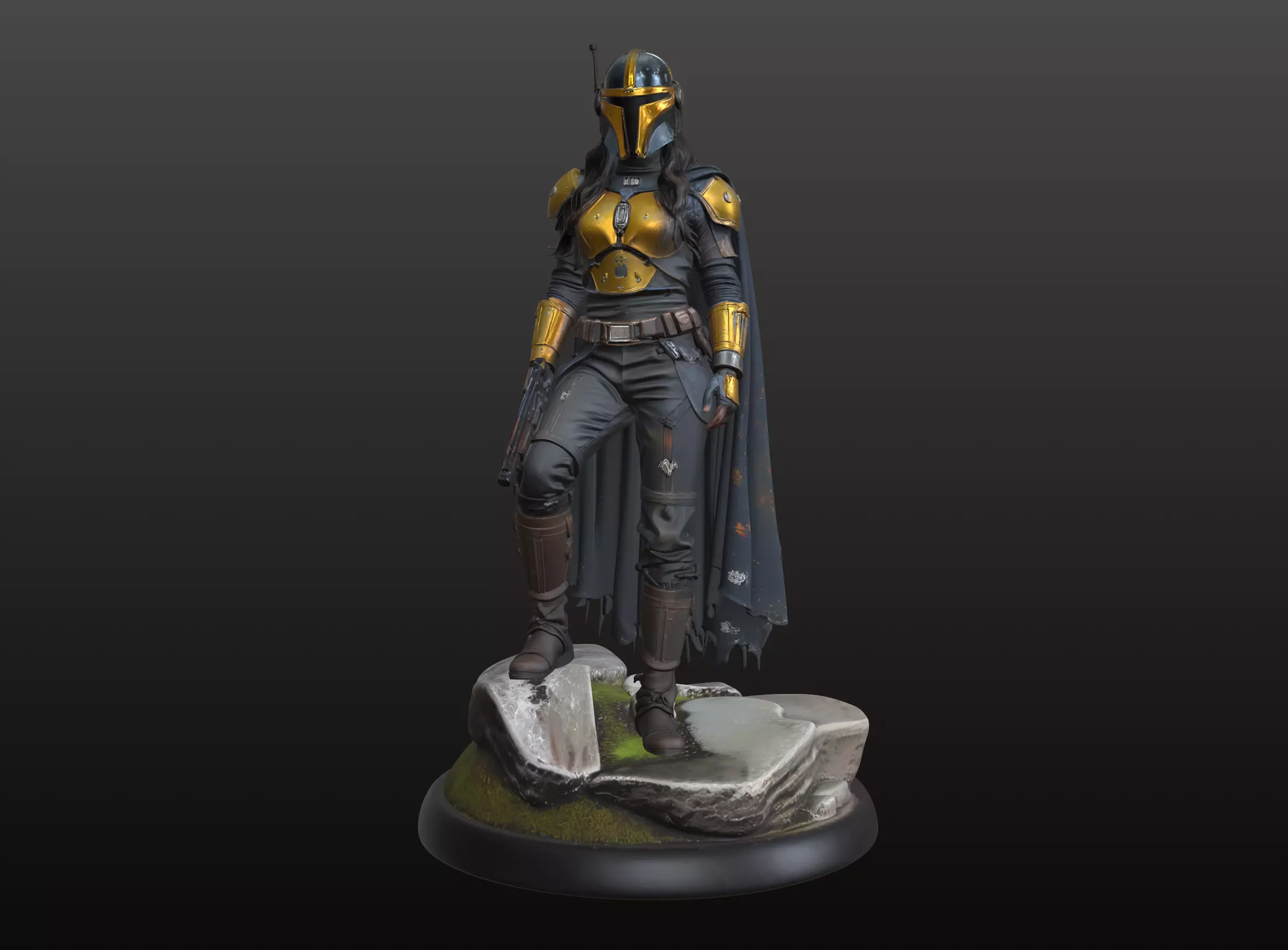 Keywords: mandalorian inspired stl, female bounty hunter 3d model, sci fi armored warrior miniature, galactic hunter stl, futuristic female soldier 3d print, unpainted sci fi figure, resin printable space warrior, single piece armored heroine, tabletop sci fi miniature, collectible galactic fighter, space armor statue stl, bounty hunter collectible model, sci fi display miniature, detailed female warrior stl, futuristic armor figure