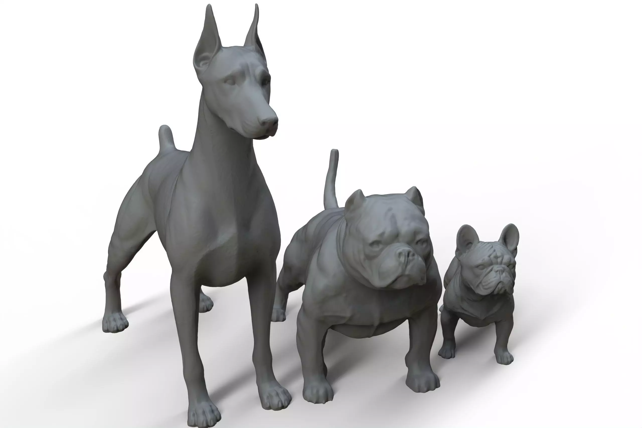This pack includes three watertight 3D printable dog models featuring popular breeds: Doberman, American Bully, and French Bulldog. Each model is fully closed (manifold) and optimized for high-quality 3D printing, ensuring reliable results across different printing technologies.