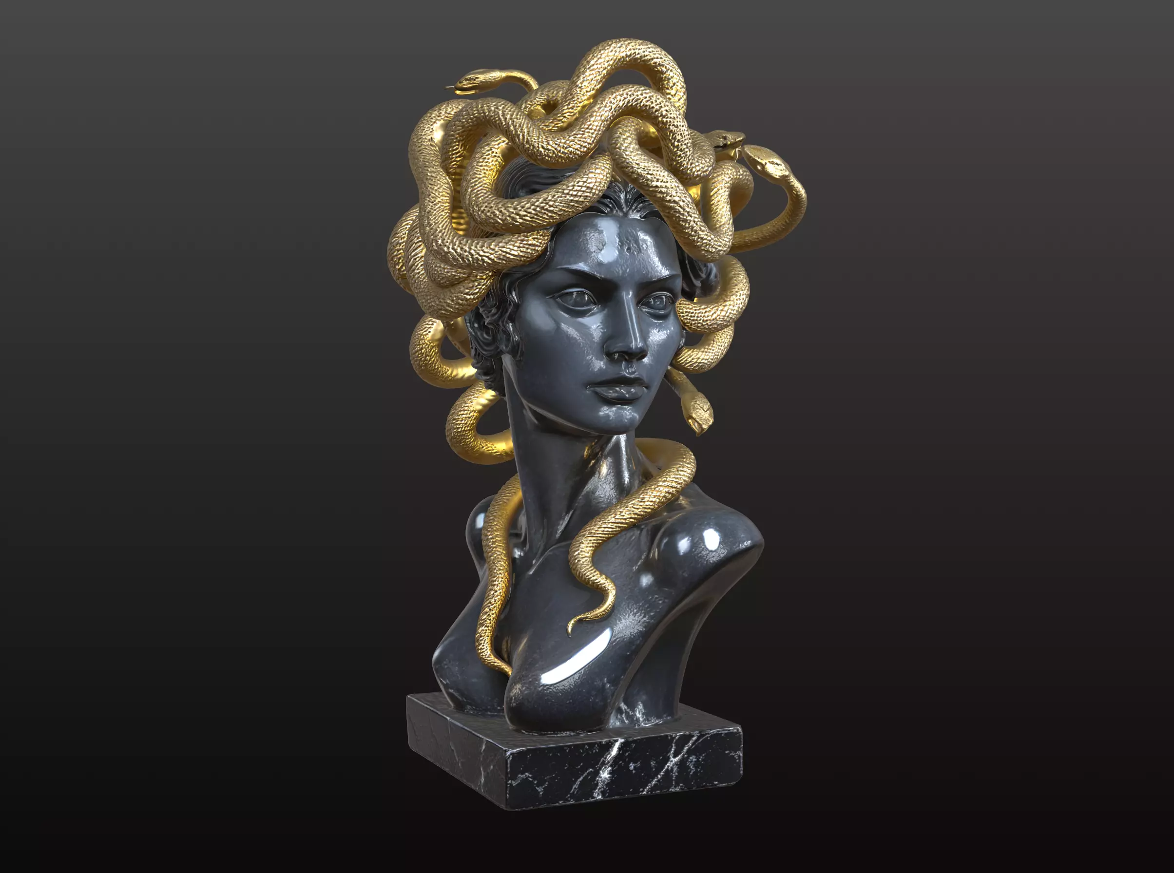 A mesmerizing and powerful 3D model representing Medusa, the legendary figure of Greek mythology. This stunning bust portrays a beautiful woman with an intense and captivating expression, her iconic hair transformed into a living crown of venomous serpents. Each snake is sculpted with care and detail, twisting and intertwining to create a dramatic and elegant composition that embodies both beauty and danger.