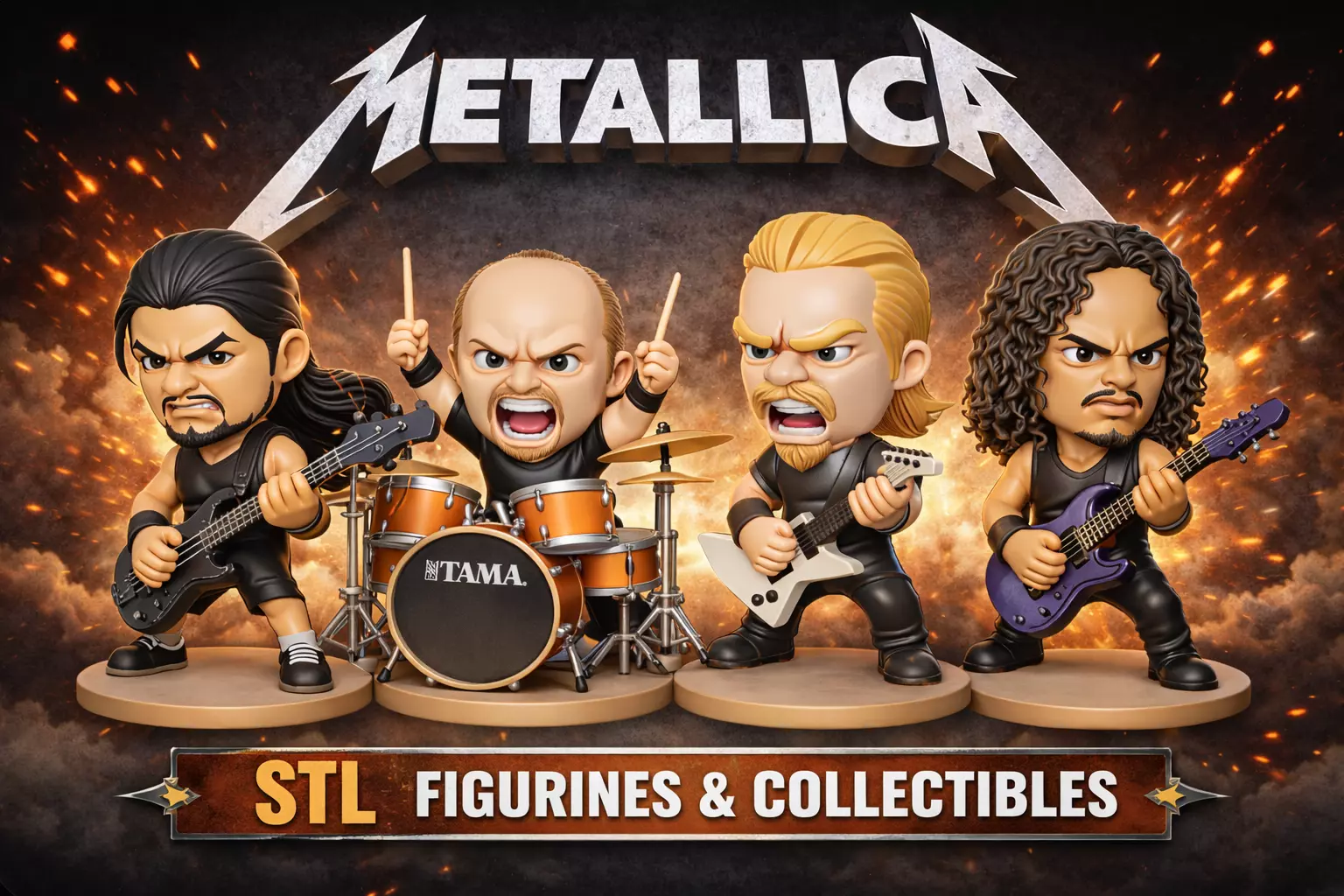 This set includes 4 chibi-style STL models inspired by the legendary metal band Metallica.