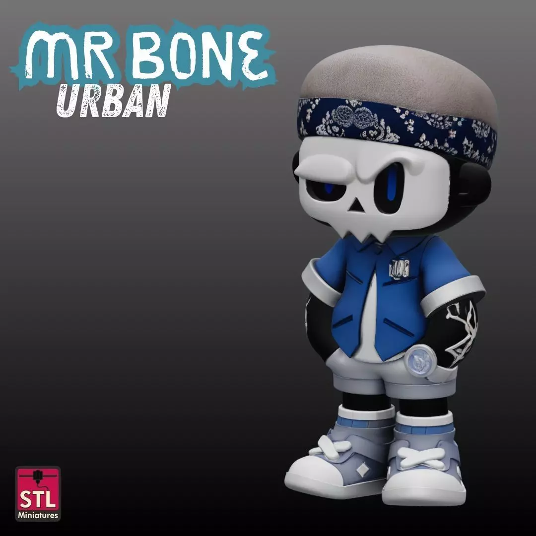 Keywords: mr bone stl, urban skeleton model, street style figure stl, 3d printable mr bone, resin skeleton collectible, t-shirt skeleton stl, bandana figure stl, single piece skeleton stl, stylized urban character stl, collectible skeleton model