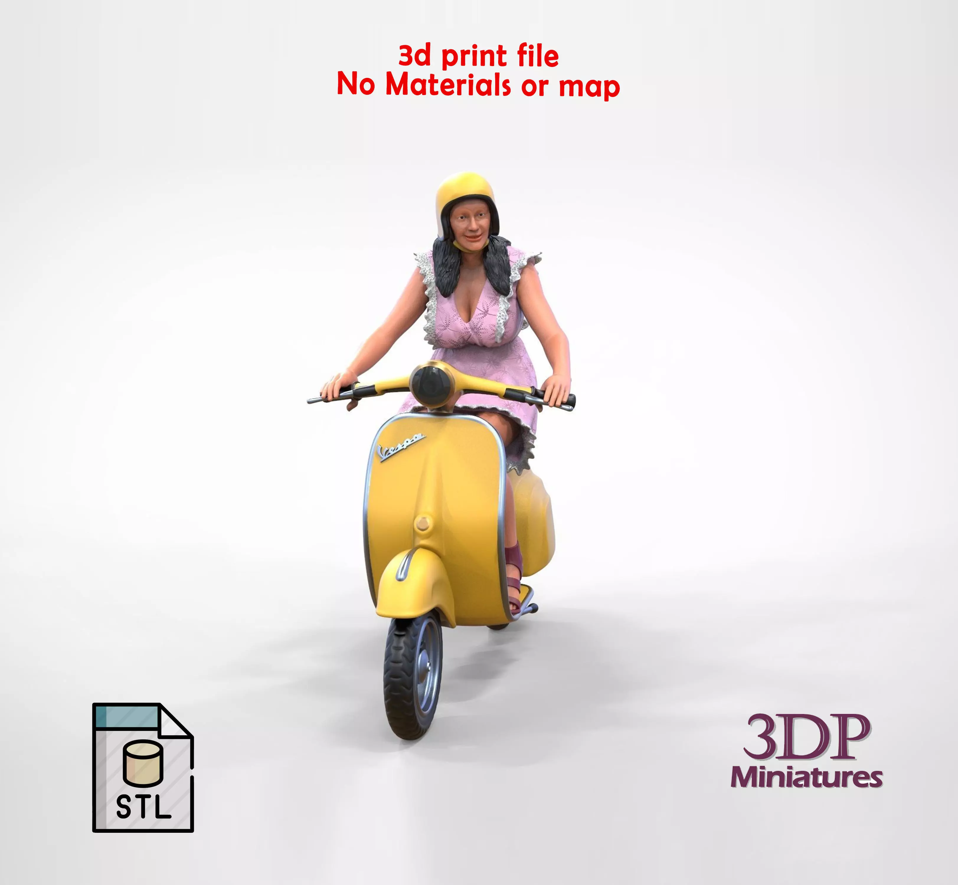Miniature, 3d print, woman on the Vespa, Motor rider, figures, figure, figurine, Diorama, posing, printable, sculpture, character,