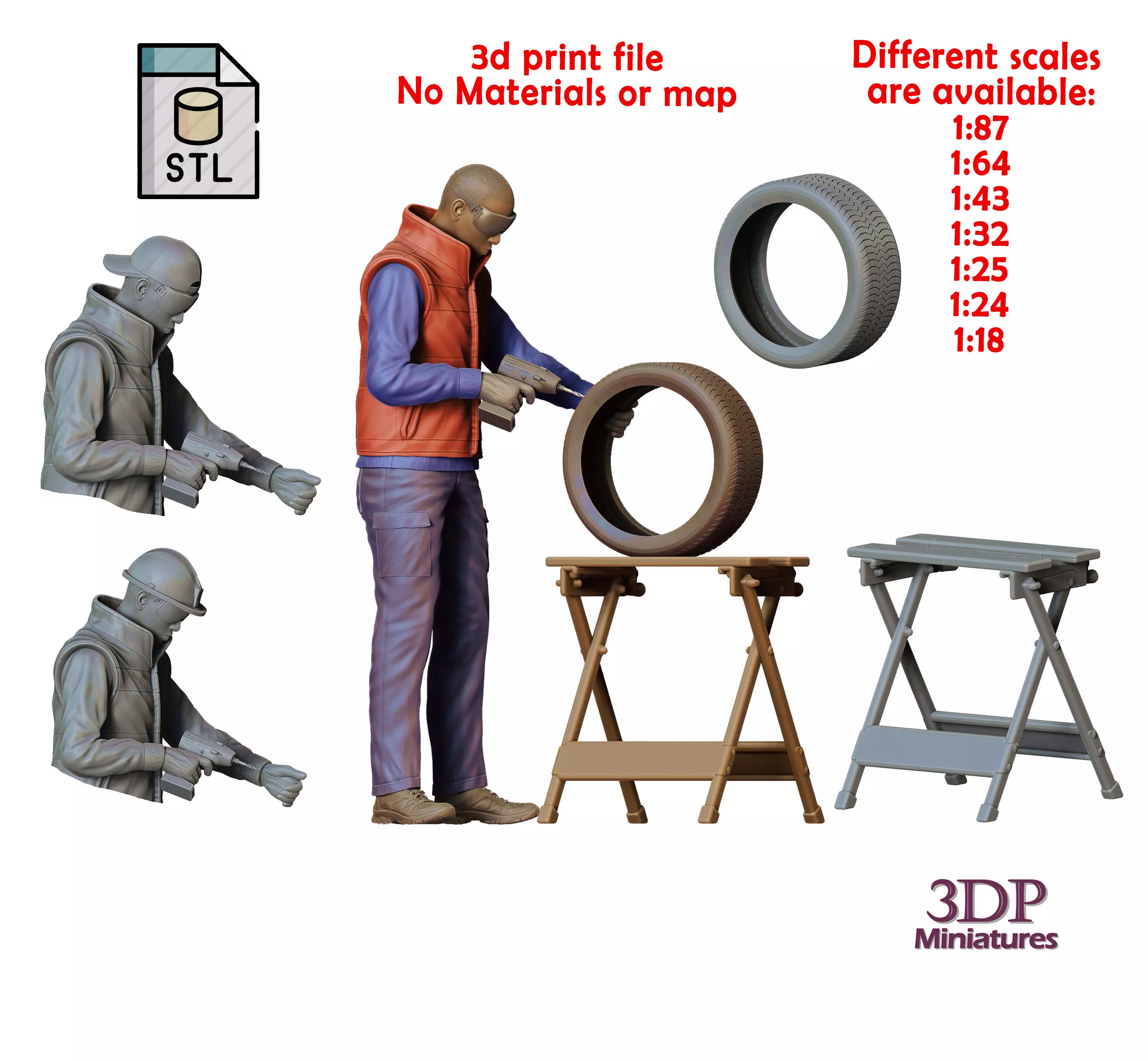 miniature, 3d-print, miniatures, Figurines, 3dp-Miniatures, Diorama, Figurine, Diecast, 3d-print-Figures, 3dpminiatures, Patreon, Mechanic, Mechanics, tire, tyre, changing-tires, crew, Standing, fixing-tire, table