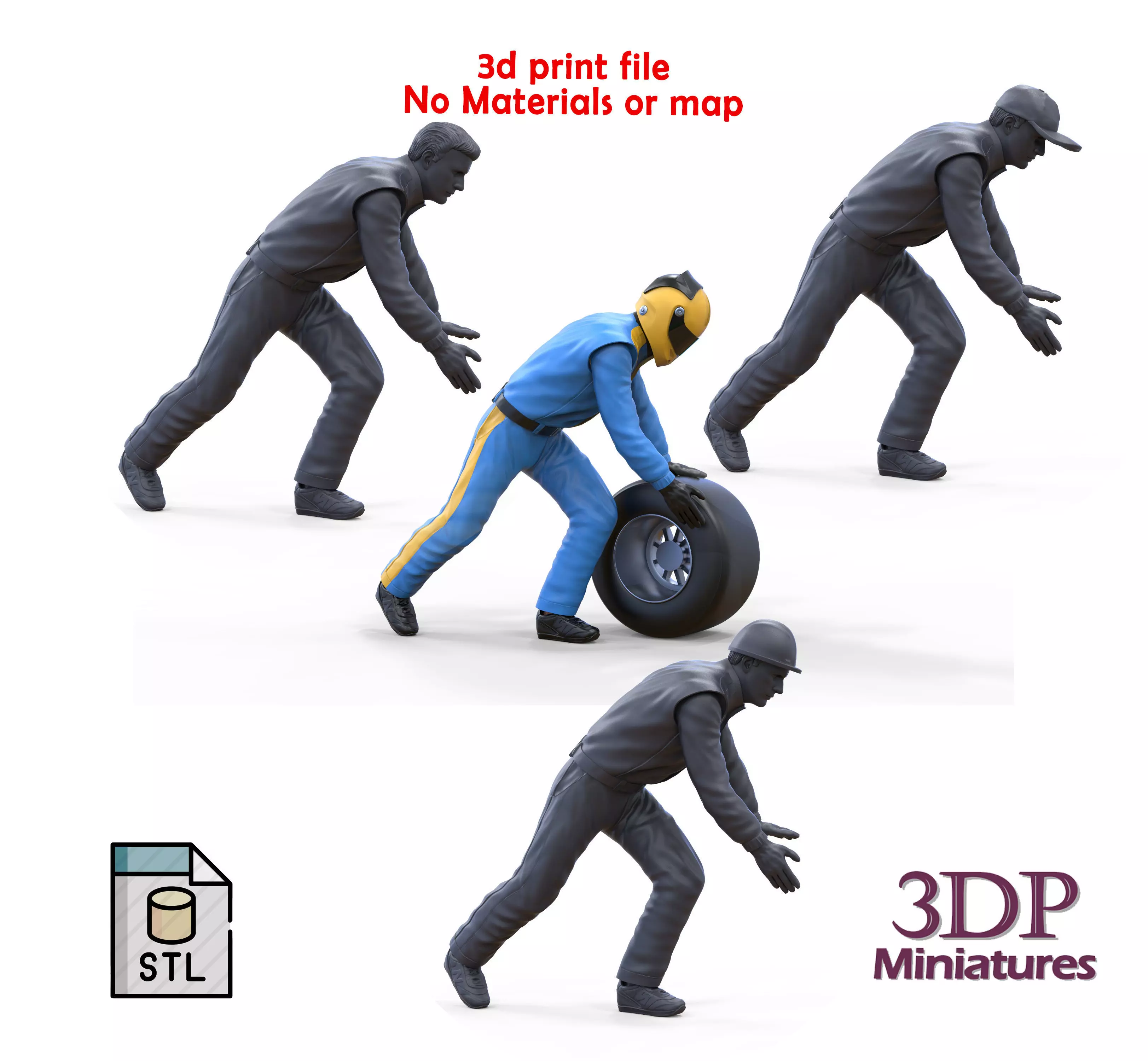miniature, 3d print, human, miniatures, Figurines, 3dp Miniatures, Diorama, Figurine, Movie, Diecast, 3d print Figures, 3d printable, Construction worker, race, Mechanic, Pit-crew, pit crew, Sunoco-Fuel-can, Sunoco Fuel can, 3dpMiniatures, Wheel Gun, tire
