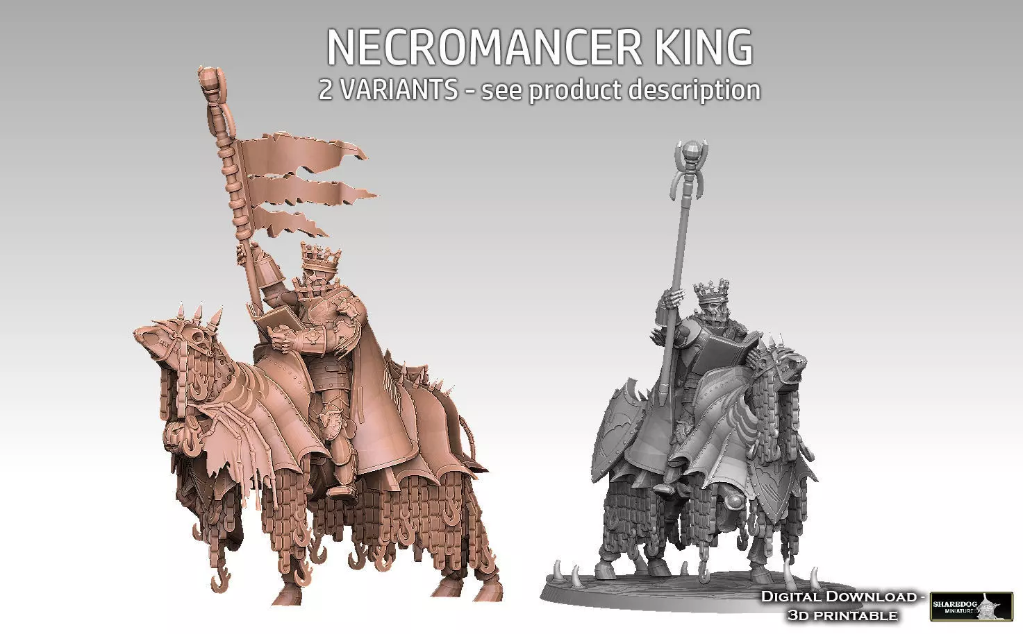 The horse and rider prints as one piece. In other words, you can't print the horse and rider as two separate parts and then assemble them post-print. There are various reasons for this, but it is mainly because I'd have to put too much work into repairing the rider if I were to export it as a separate model. There IS a horse included as a separate model, but if you want to use the necromancer itself you have to print it together with a horse.The model is recommended for between 20 and 28mm scale tabletop games. The default scale of all included model parts is 28mm when you load them into your slicer, but you can easily alter their size prior to print should you want to. Note that I do not recommend printing the models at larger than 28mm scale. There were some minor issues with printability I had to solve by adding a shell to the model. I want to stress that these issues are now resolved, but the shell does mean the model will look grainy if you scale it up too much.