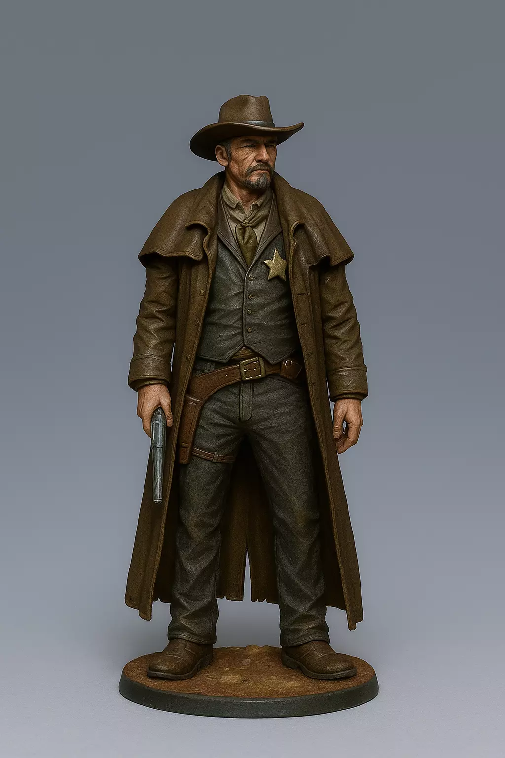 Bring the spirit of the Wild West to your collection with this highly detailed Old West Sheriff 3D model.The model depicts a rugged lawman in classic Western attire – wide-brimmed hat, long duster coat, vest, holster with revolver, and sheriff’s badge.Perfect for 3D printing, painting, or diorama displays.