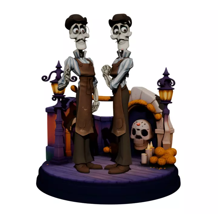 Cada figura ha sido esculpida como modelo completo en una sola pieza, e incluye una base temática compartida que recrea un rincón del taller de zapatos o el ambiente festivo del Día de Muertos. Sus poses y expresiones capturan su esencia gemela pero con pequeñas diferencias que los hacen únicos: uno con sonrisa pícara, otro con gesto más reservado, pero siempre juntos y siempre dispuestos a compartir una historia.