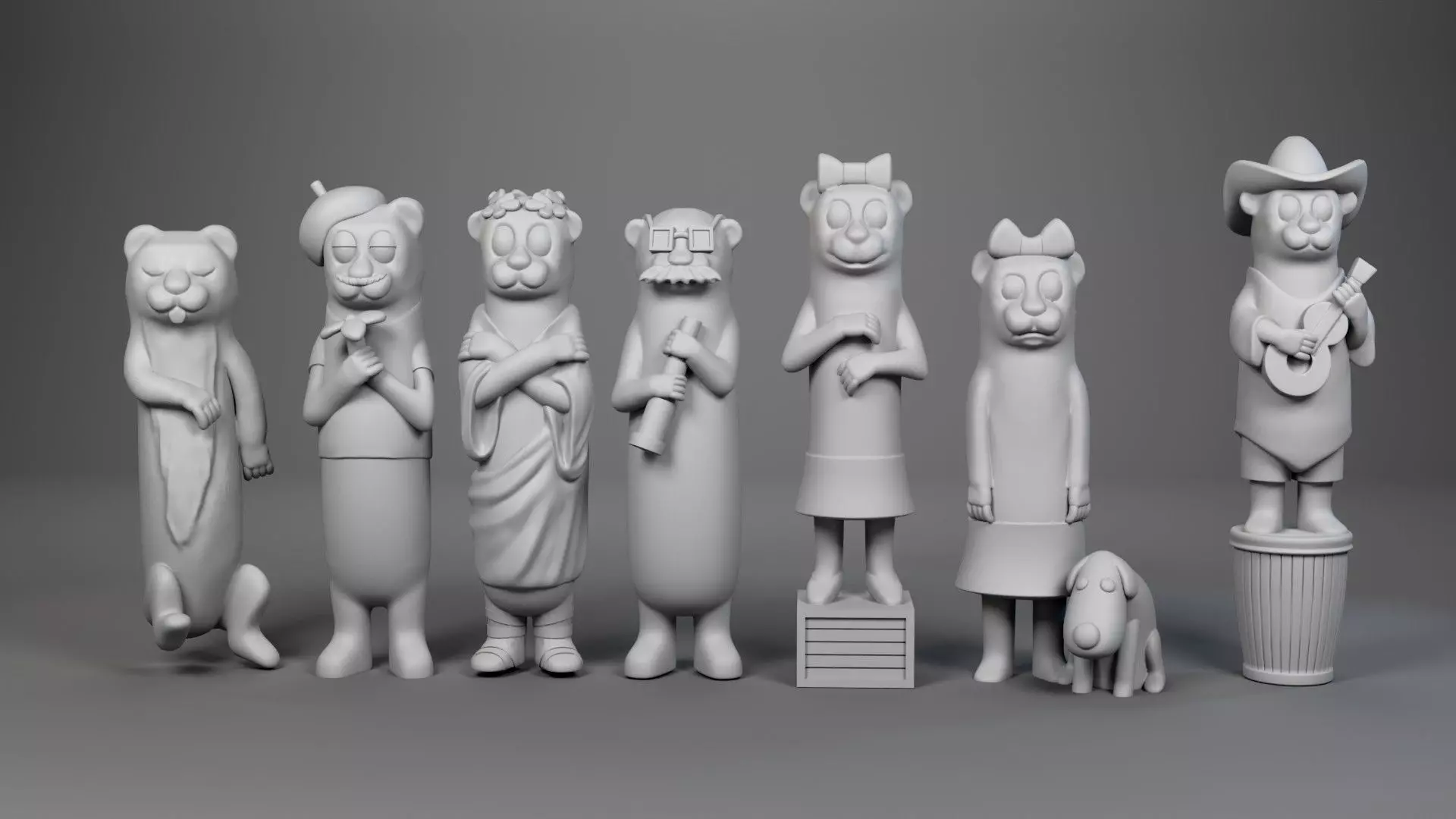 complete set of 3D printable miniatures featuring the iconic Otter Pops mascots. This collection includes seven unique characters designed in a vintage promotional toy style