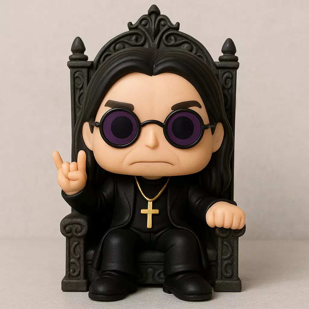 La figura representa a Ozzy Osbourne en estilo chibi, con proporciones caricaturescas y adorables. Está sentado en un trono oscuro ornamentado, que evoca una atmósfera gótica y majestuosa. Su atuendo es completamente negro, con detalles dorados que resaltan su icónica estética. Lleva unas gafas redondas moradas, cabello largo y oscuro, y un collar con cruz dorada, elementos característicos del músico.