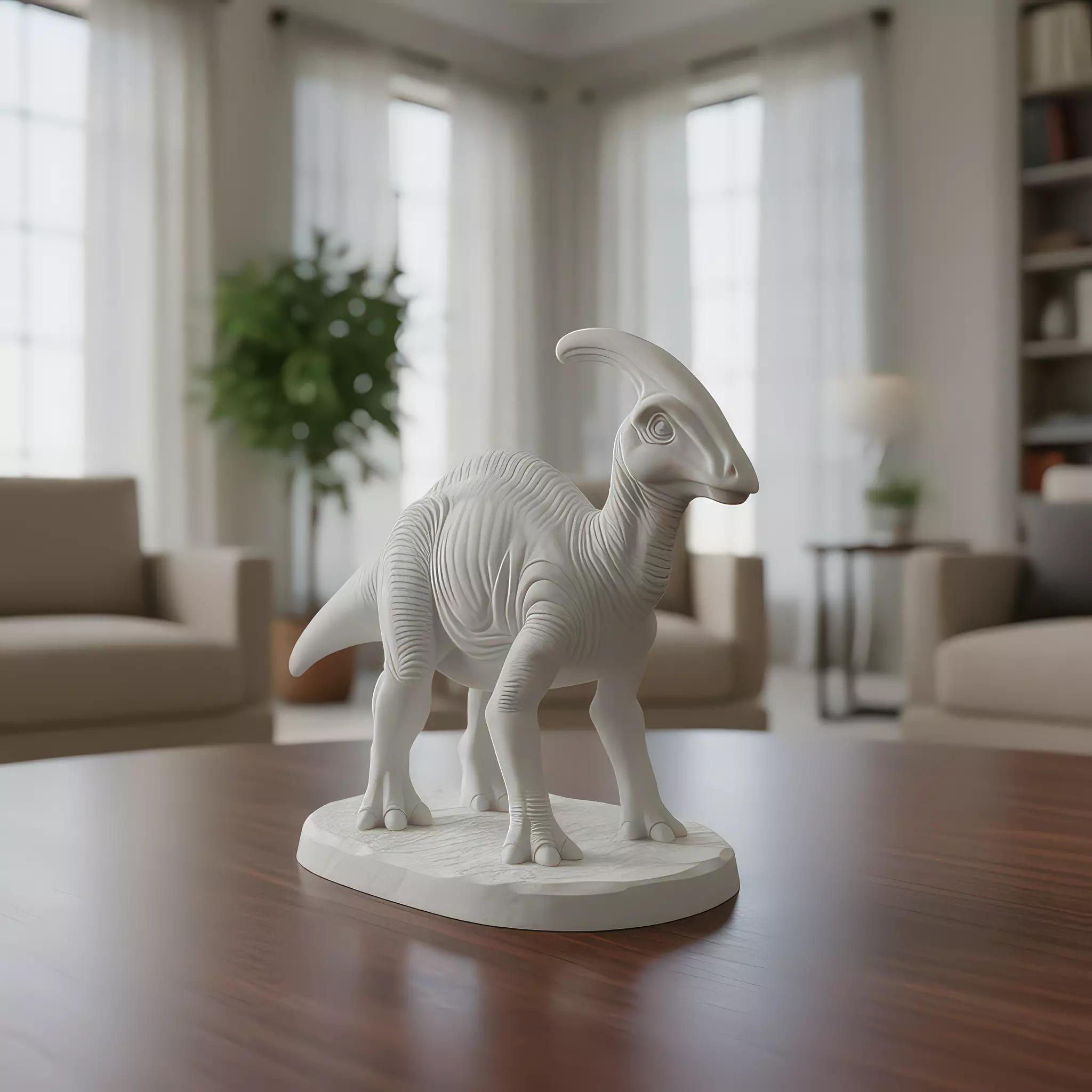 A highly detailed Parasaurolophus statue captured in a calm walking pose with its signature backward-curving crest, realistic skin folds, and an integrated oval base for stability. This elegant hadrosaur makes a perfect prehistoric display piece or educational model.
