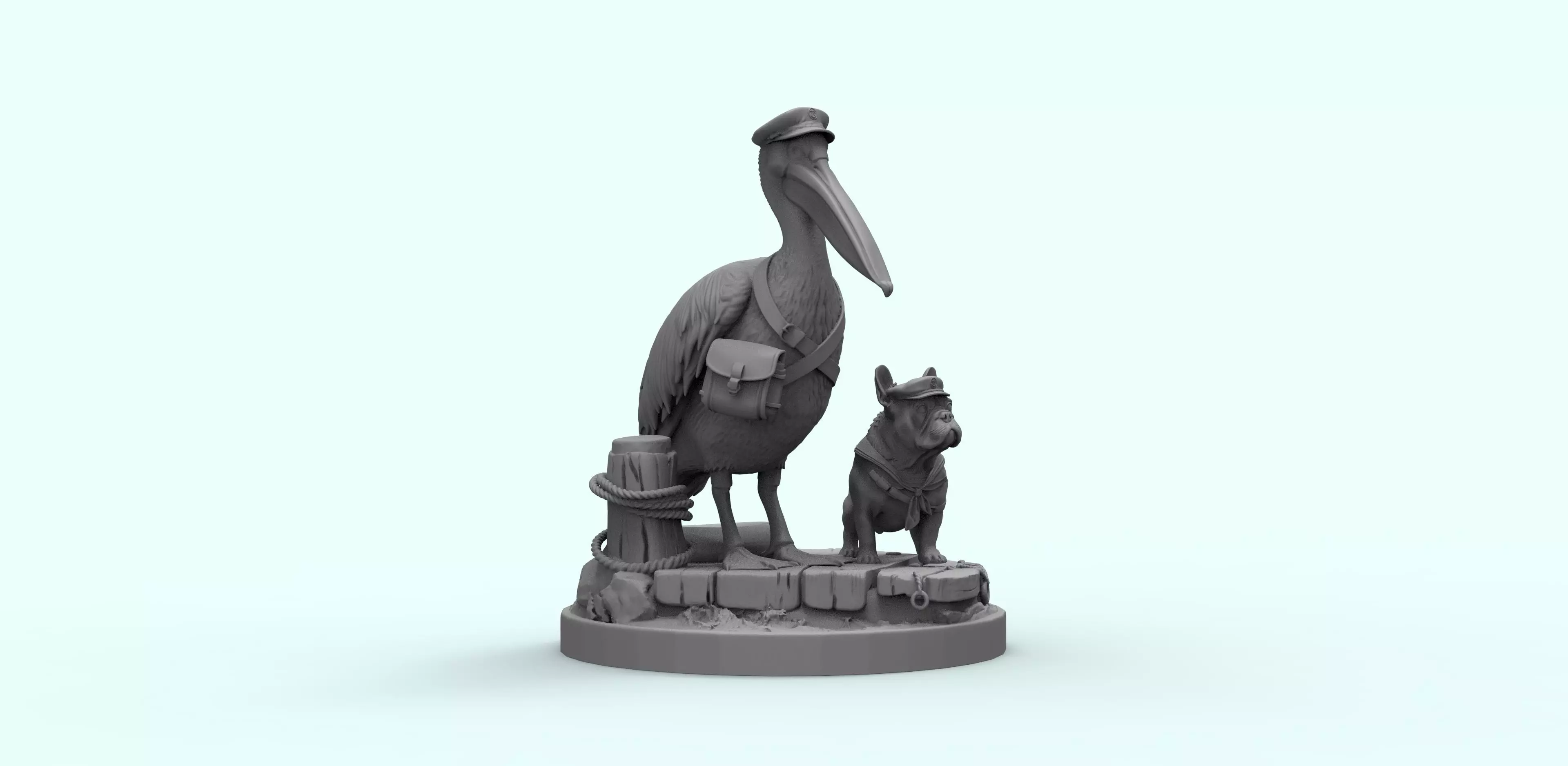 • Detailed pelican wearing captain hat and shoulder bag• French bulldog dressed in sailor outfit• Wooden pier base with rope, mooring post and sea details• Strong vertical composition with clear silhouette• Carefully sculpted feathers, fabric folds, wood texture and water elements