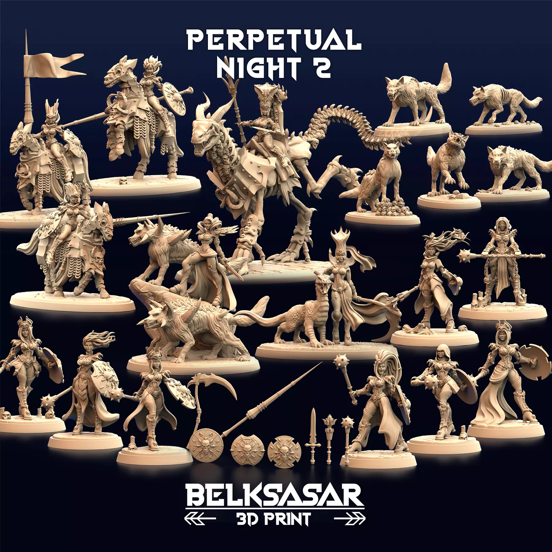 • Calista Perpetual Whisper NSFW and Clothed - Base 80x46mm• x5 Night Keeper - Base 32mm• x3 Night stalker - Base 70x44mm• RedMoon Zealot - Base 60mm• x2 Wolf RedMoon Zealot - Base 60mm• x5 Redmoon Wolf - Base 60x35mm• x2 Scourge of Mortals - Base 40mm• Zaerith Matriarch of the Night with rider - Base 120x92mm• Zaerith Matriarch of the Night Basic - Base 120x92mm• 8 Props• 17 Bases