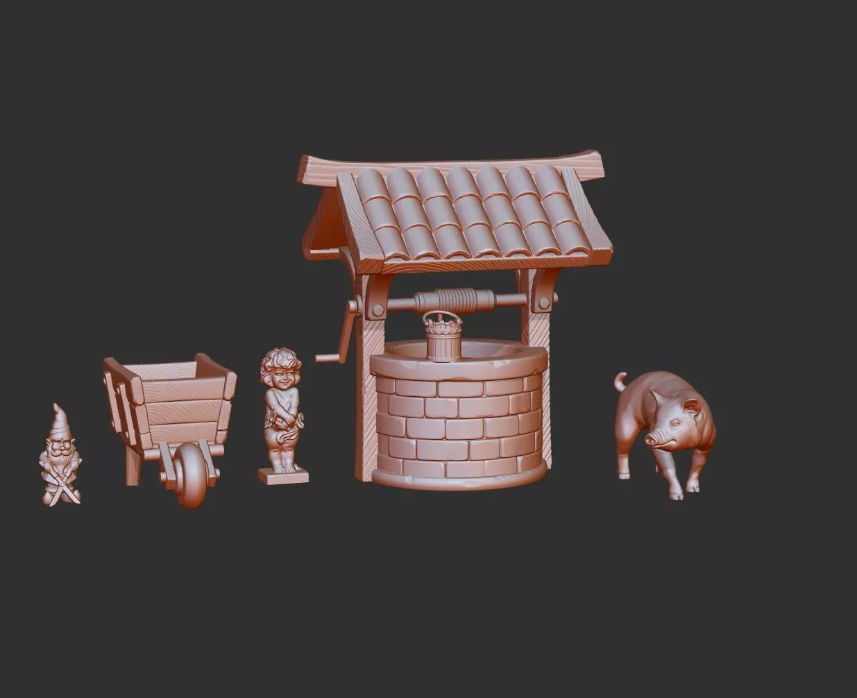 Add a touch of whimsical charm to your garden or tabletop with this delightful 3D printable set, perfect for garden decoration or board games. This detailed collection includes a Pig, an adorable, plump figure with realistic features, a rustic Water Well designed with intricate wooden textures and a classic, timeworn look, a jolly Garden Gnome with a mischievous expression, and a Wooden Wheelbarrow featuring carefully crafted details, from the handle to the wheels.