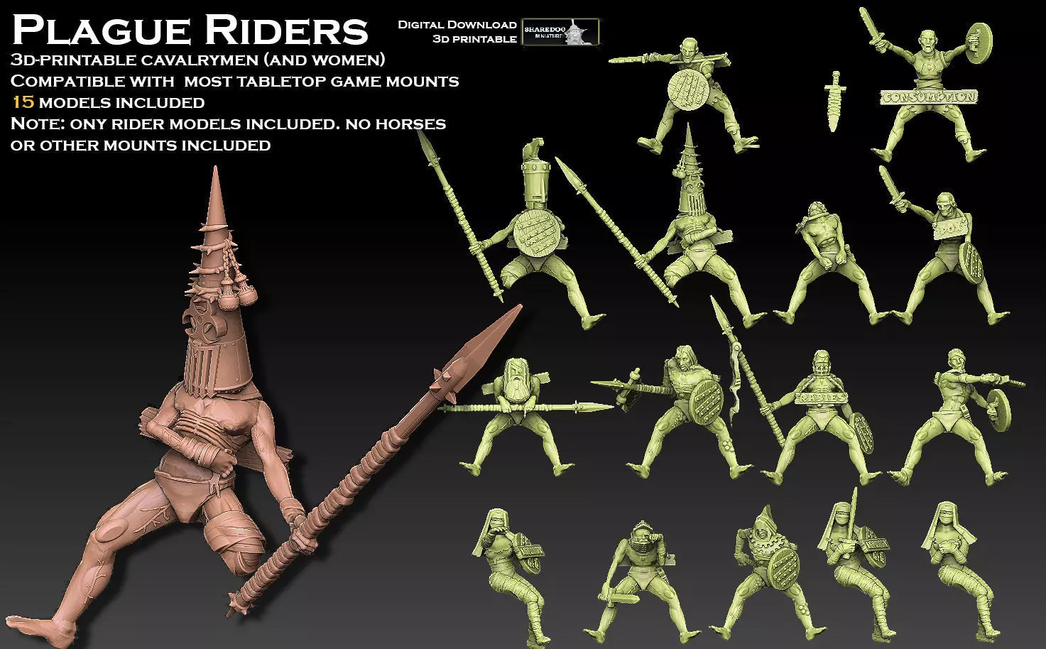 Diseased, scantily clad cavalrypersons (both genders included). 15 rider models included in total. See image gallery for renders of the entire model lineup.Thematically, the riders are compatible with nurgle armies, flagellants, evil cultists et cetera. Every rider has a sign hung around their neck, spelling out their particular ailment. They are suffering from consumption, expiring from the pox, losing limbs from leprosy et cetera.