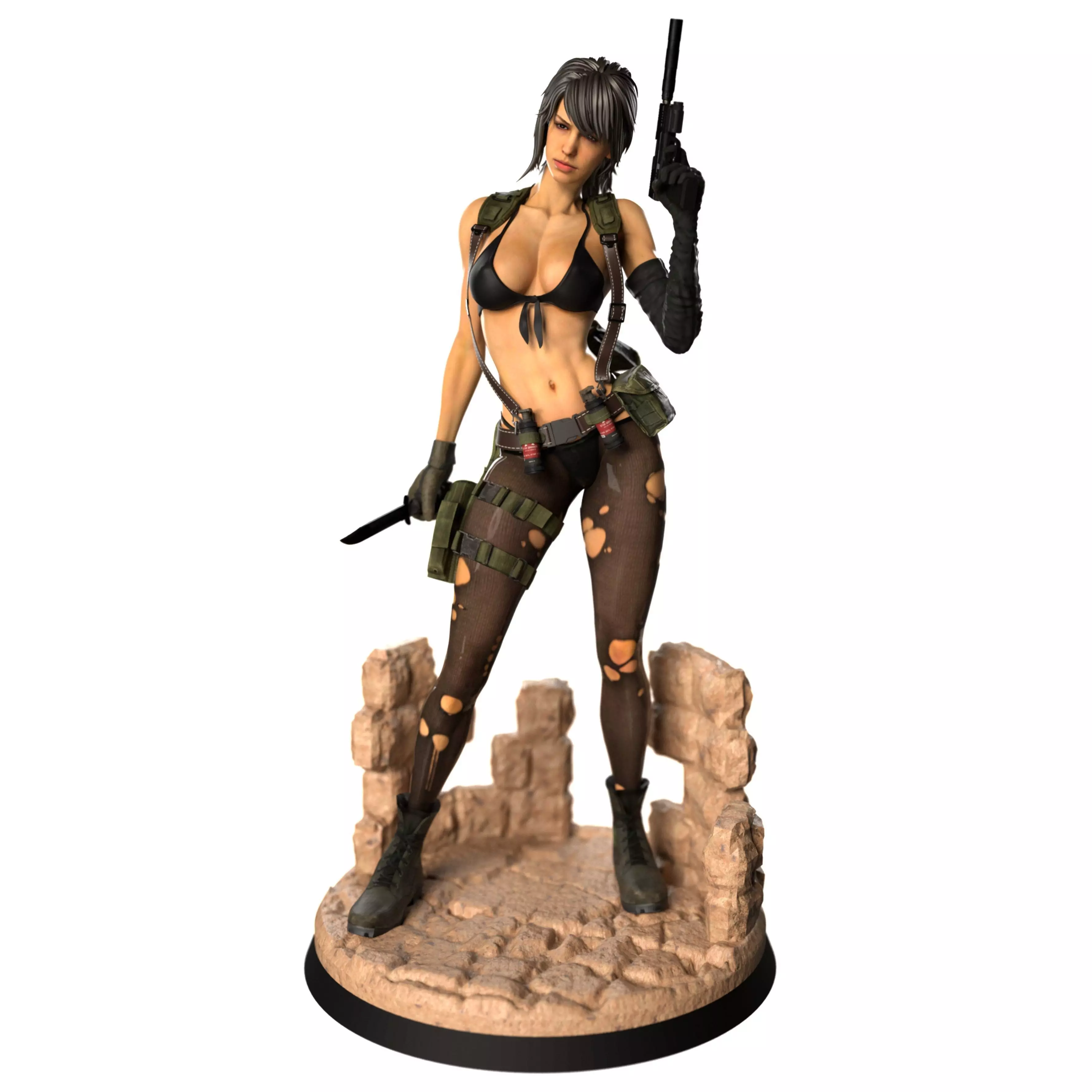 Enhance your collection with this high-detail sculpt of the legendary scout from Metal Gear Solid V: The Phantom Pain. This unique version captures Quiet in a focused, close-quarters combat stance, featuring a tactical handgun instead of her traditional sniper rifle.