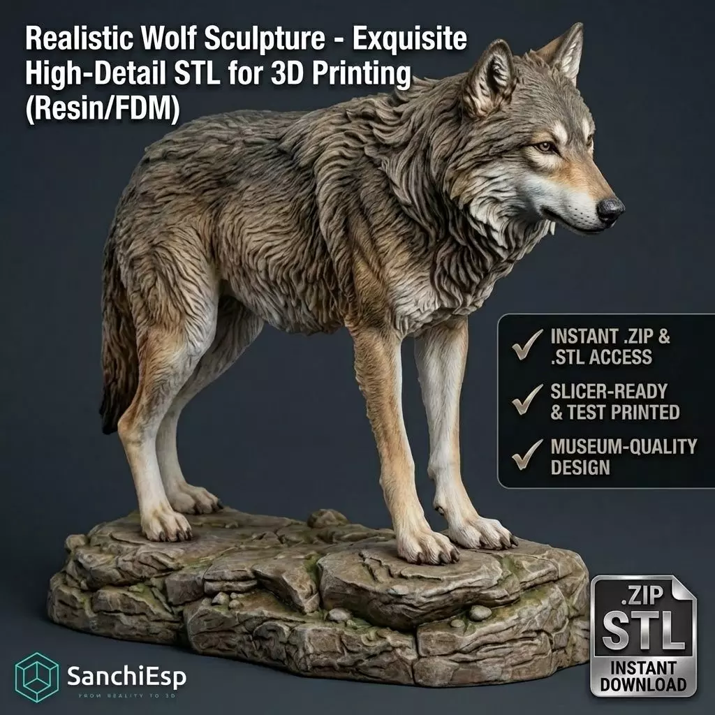 Meticulously sculpted, this high-resolution model captures the true power, grace, and intensity of a wolf standing atop a detailed, weathered rock base. From the intricate, flowing fur texture to the powerful muscle definition, every detail has been refined to ensure a jaw-dropping result, whether printed in resin or filament.