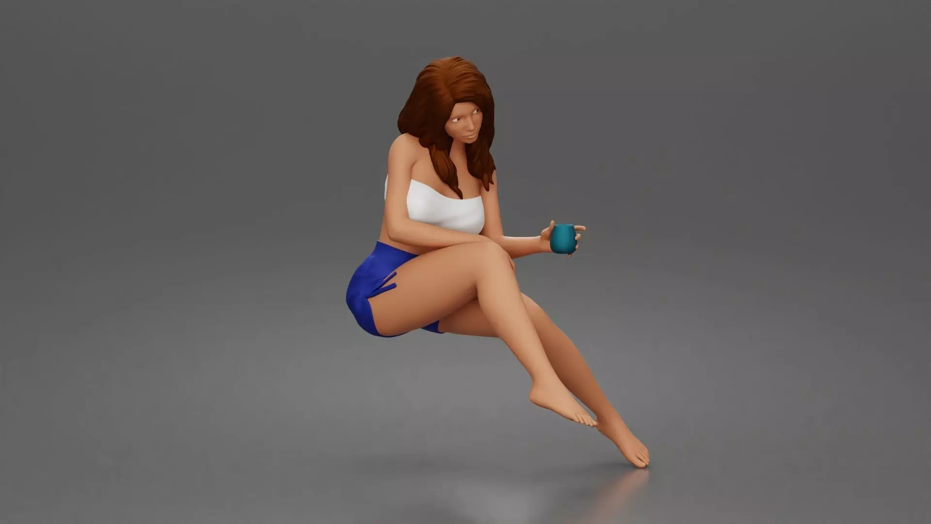 Relaxed woman sips morning coffee wearing summer top and shorts 3D print model