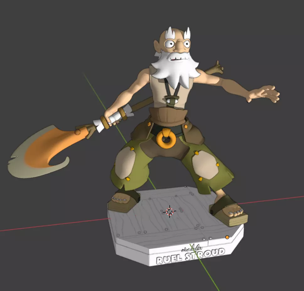 Ruel Stroud is based on a character featured in a French Anime series called Wakfu. Ruel is depicted in a battle stance, ready to defend himself using his shovel-like spear. Ruel is a colorful character with an obessesion for gold. Ruel was a compicated character to translate into 3D. The series is a 2D animated series, so developing a 3D design embodying the most common proportions, details, and characteristics of Ruel was challenging. Ruel has been designed to be printed in several parts, making it easier to print while maintaining important details and cleaner results. The default scale is just over 75mm assembled. The model can be scaled up or down for printing, but scaling down too far with increase the fragility of thinner parts. The model has been provided in STL format, a universal format for 3D printing, accessible from most 3D and slicing apps.