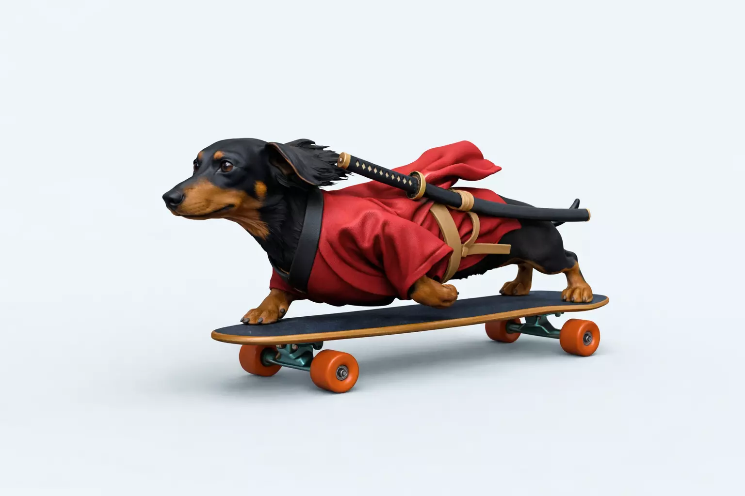 • Detailed dachshund wearing samurai robes• One swords mounted on the back• Dynamic low riding pose with strong forward motion• Clean silhouette ideal for display and painting• Carefully sculpted anatomy, fabric folds, and accessories