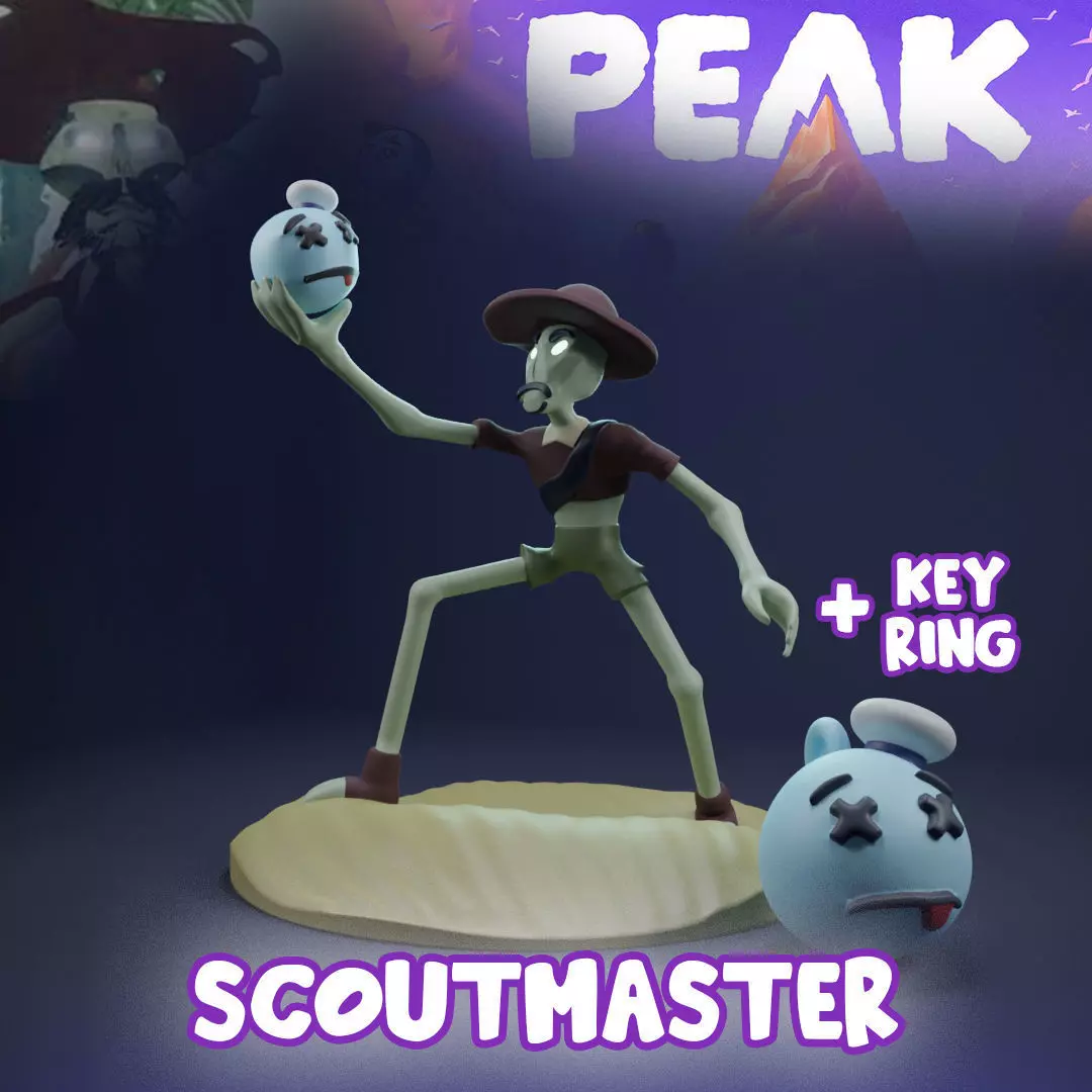 Scoutmaster Fanart figure model from the game PEAK, in a pose, raising one hand with a head in it + a keychain of one of the PEAK characters' heads.