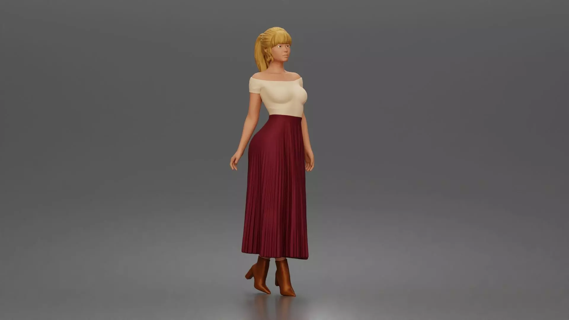 shopper strolls downtown wearing off shoulder top pleated skirt 3D print model