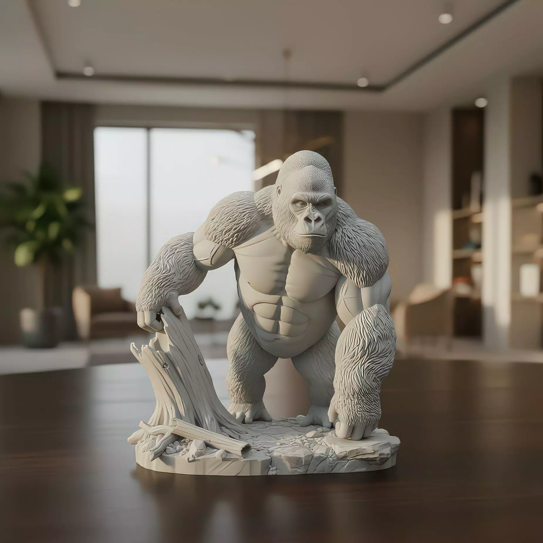 A highly detailed, stylized 3D printable model of a powerful silverback gorilla. This sculpture features a heavily muscled physique, captured in a dominant stance on a detailed forest floor base with a broken tree stump. The design combines realistic anatomy with an artistic, powerful aesthetic.