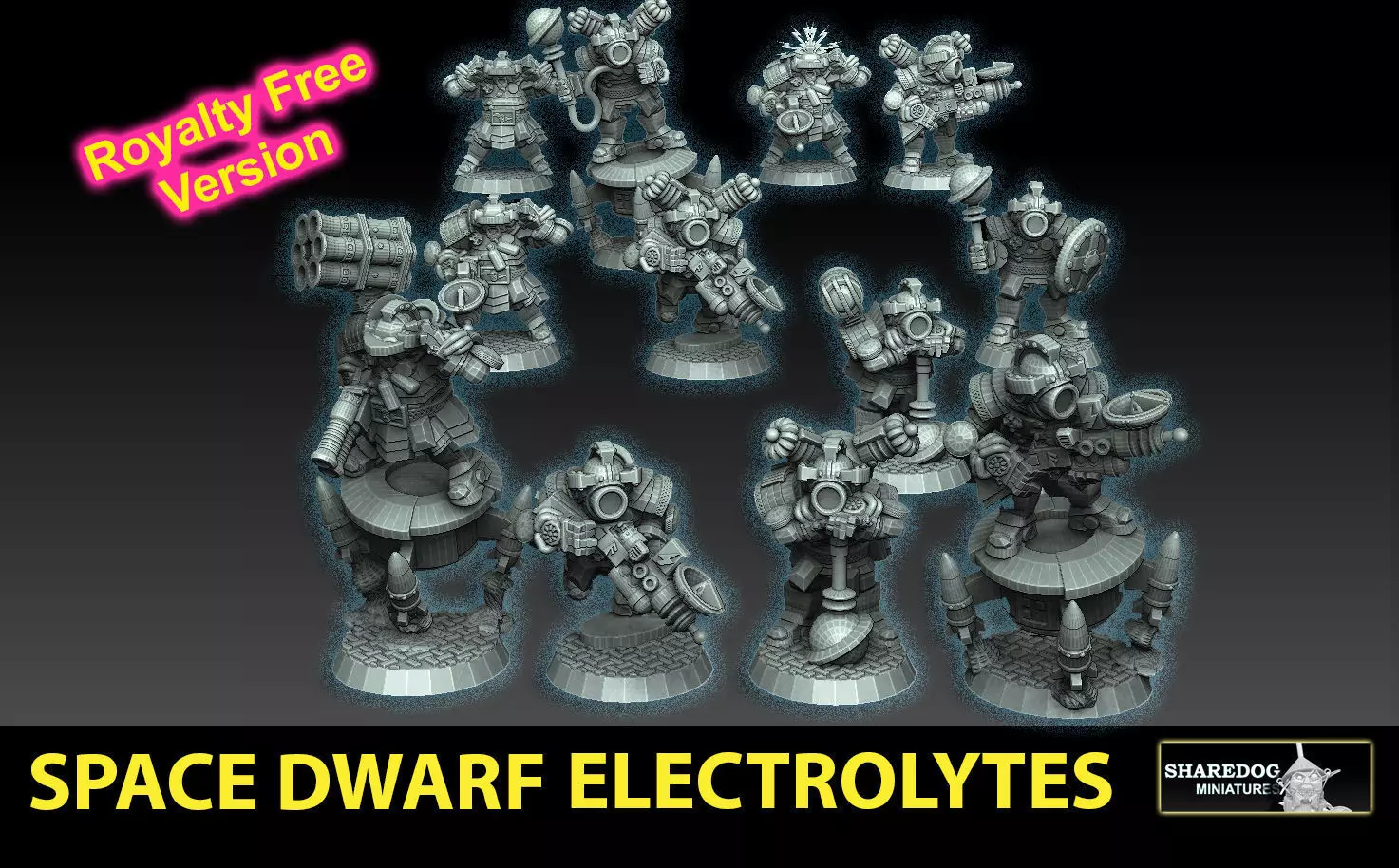 The squad contains a total of 15 unique dwarf models (see image gallery for a complete visual presentation of every model). Besides Electrolyte models, the squad also includes a couple of common soldier models that were left over from the 2nd Space Dwarf Megapack that was recently published as a separate product (link below).
