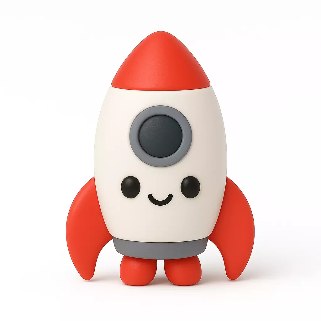 A small, rounded rocket with bold side fins, a circular window, and a smiling face. The integrated base and fins create a stable footprint, making it perfect for space-themed desks and kids' rooms.
