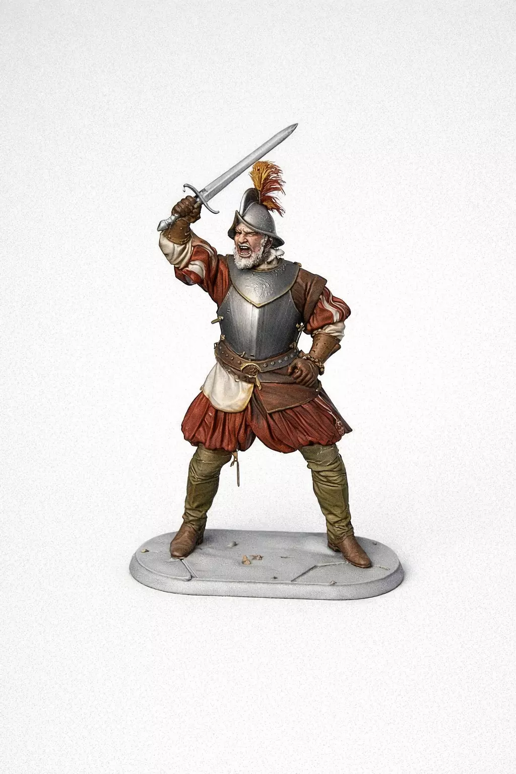 This dynamic 3D model depicts a Renaissance-era Spanish warrior in a powerful battle pose, raising his sword and rallying troops. Designed for painters, collectors, diorama builders, and tabletop gamers who appreciate historical character and dramatic action.