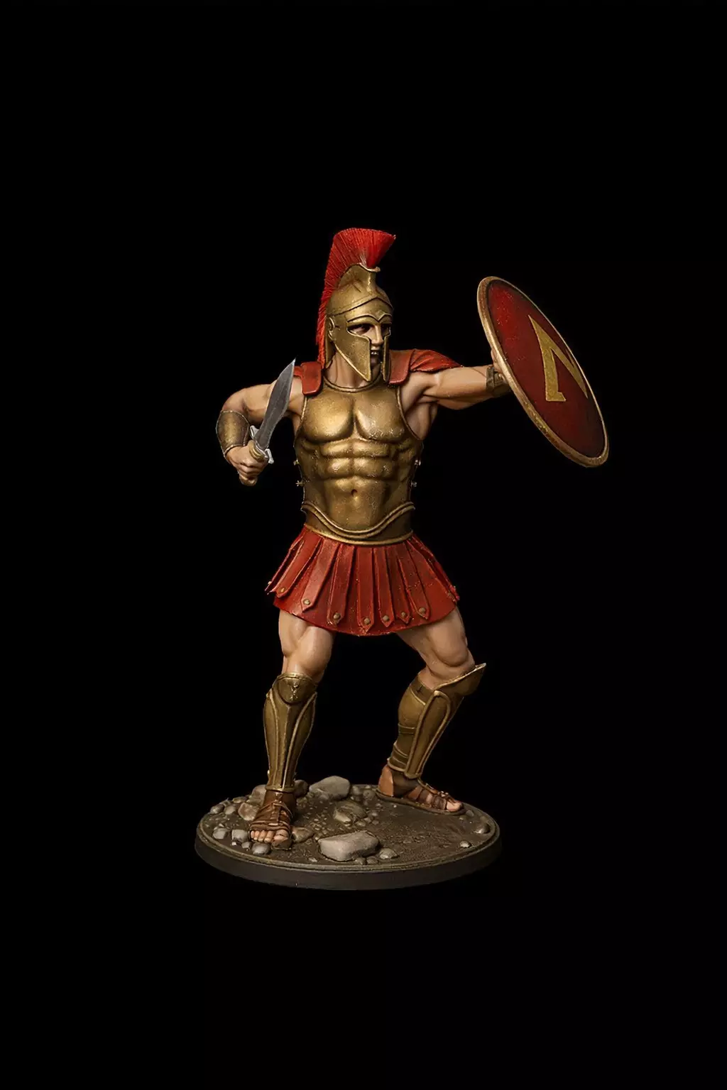 • Ancient Greek hoplite in battle stance• Spartan helmet with crest• Round shield with lambda symbol• Short sword• Detailed muscles, armor, and base• Perfect for painting and tabletop use
