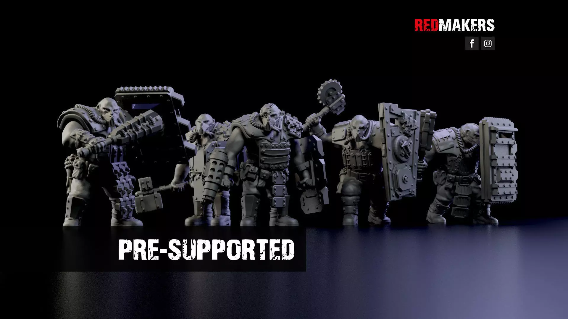 The squad consists of five units. Five types of shields and five types of weapons are applicable to each unit. Scaled for 28 mm tabletop. Approximate height to the eyes - 46 mm (varies in different poses).