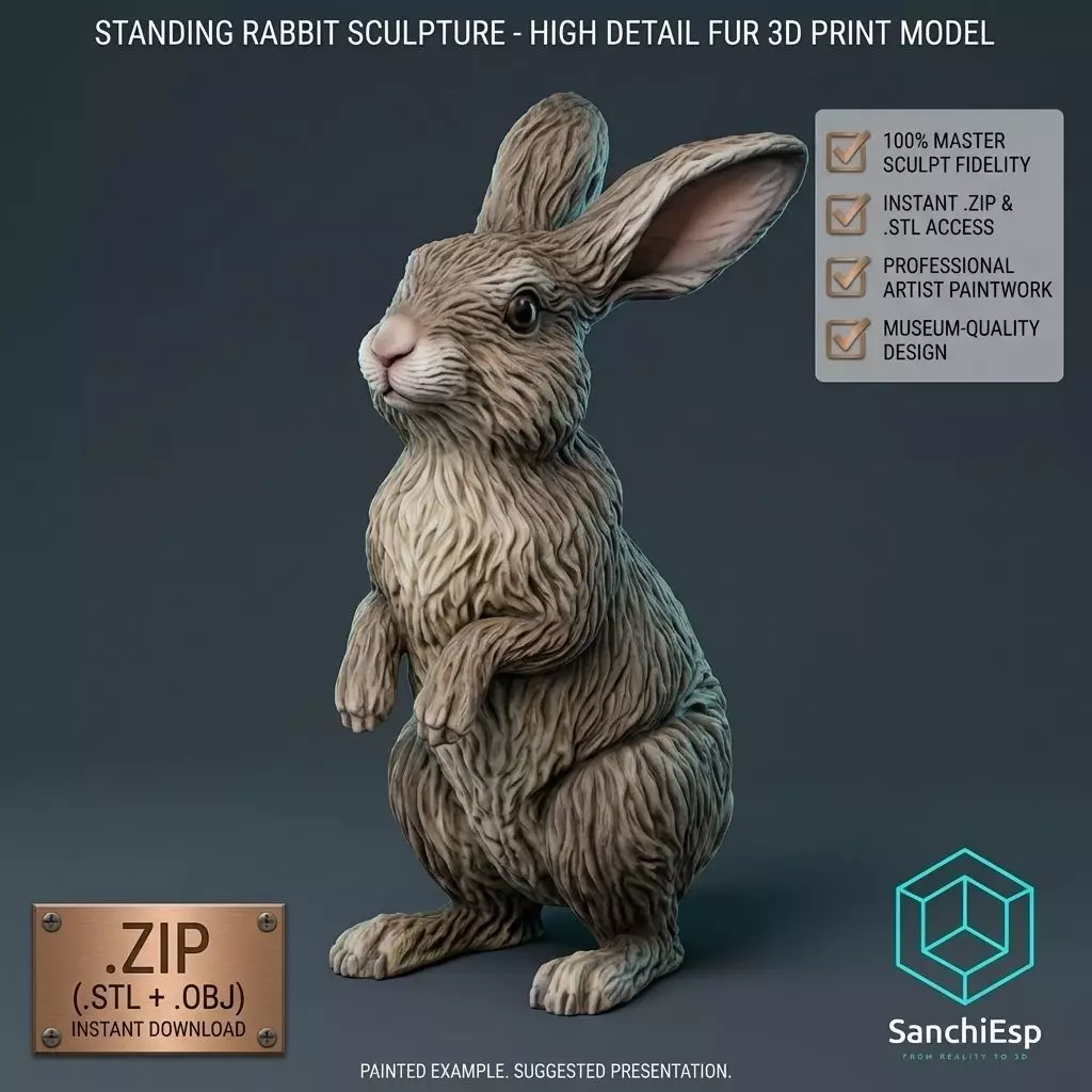 Bring a touch of nature and artistry to your projects with this highly detailed Standing Rabbit Sculpture. This professional-grade 3D model captures the lifelike texture of rabbit fur and the alert, charming pose of a wild hare or domestic rabbit. Perfect for high-end architectural visualization, interior decor renders, 3D printing enthusiasts, or as a high-poly base for digital art.