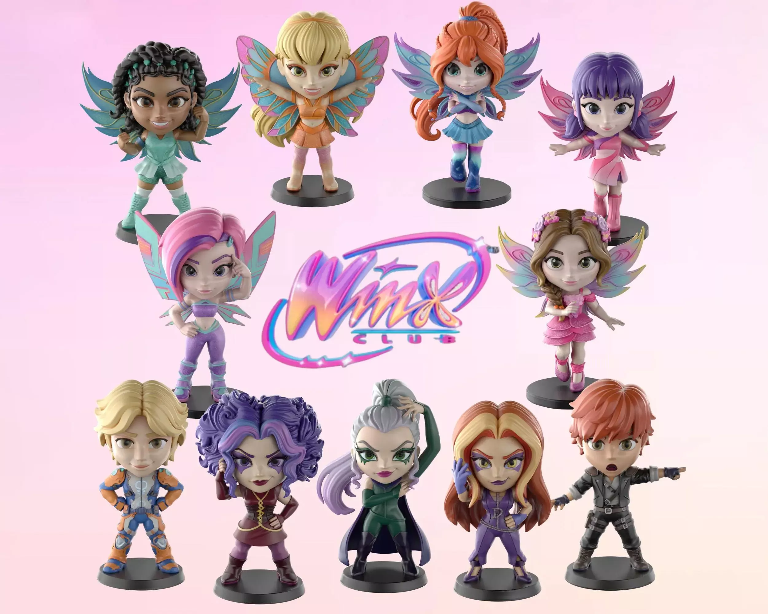 Bloom, Stella, Flora, Aisha, Techna, Musa, plus the Trix villains Icy, Darcy, and Stormy, along with Damien and Sky. Each one captures the character's magical personality in easy-to-print STL files perfect for fairy fans and collectors.