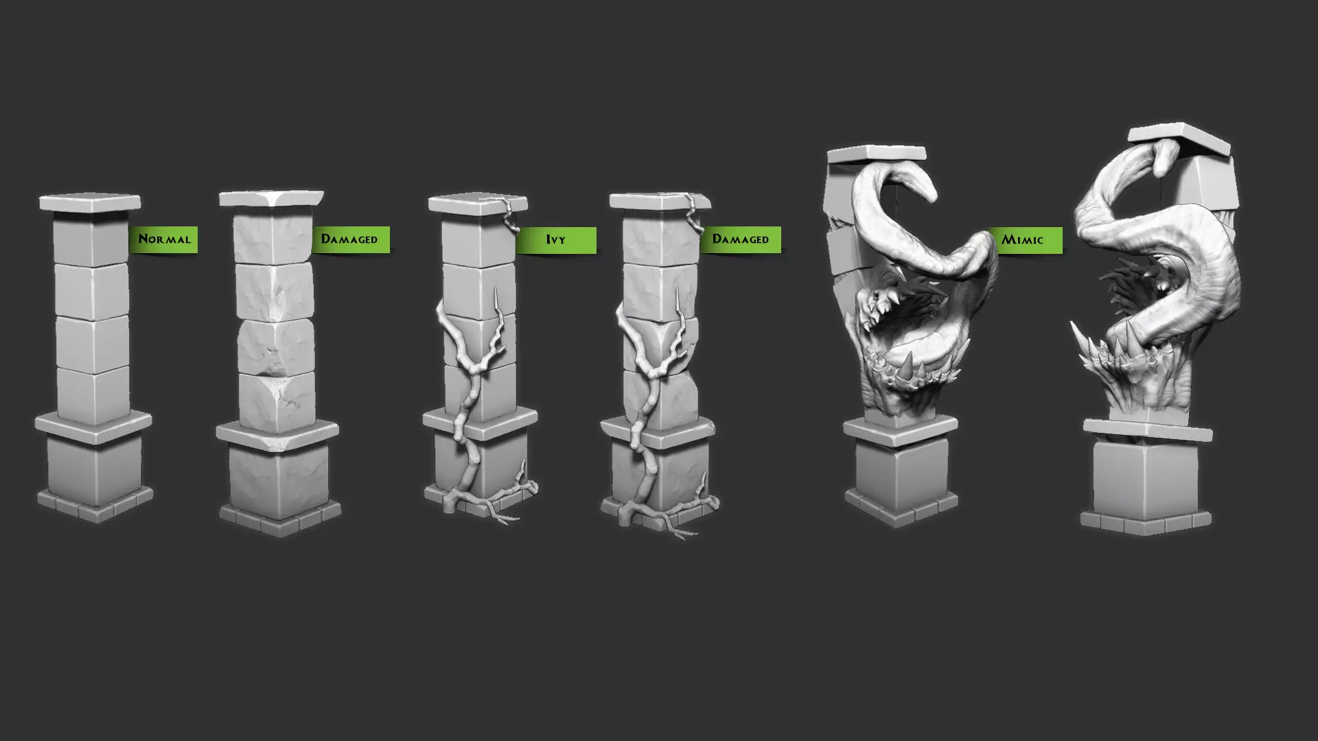 In the Dungeons & Dragons and other fantasy role-playing game, the mimic is a type of fictional monster. It is portrayed as being able to change its shape to disguise its body as an inanimate object, commonly a chest. The mimic has a powerful adhesive that holds fast to creatures that touch it, allowing the mimic to beat its victims with its powerful pseudopods. If you are like me and got tired of ordinary chest mimics, this set is for you. You can use these ordinary looking terrain pieces in your game and suprise your players with a mimic. Nobody will expect a pillar to be mimic.
