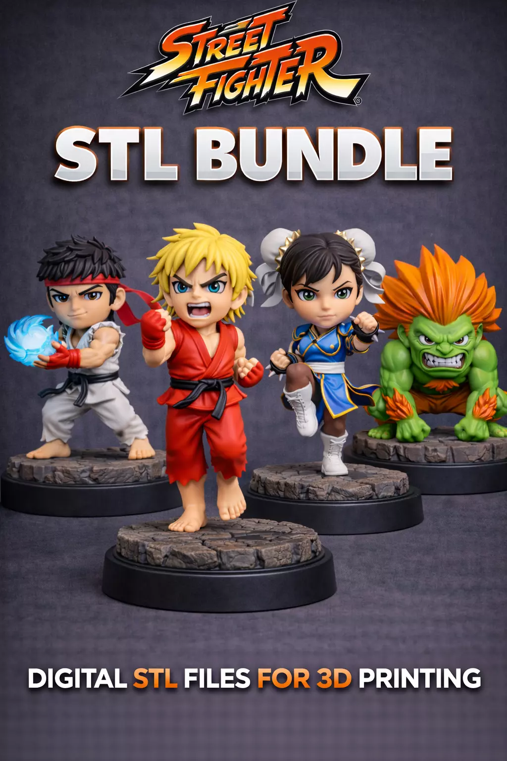 Street Fighter Chibi STL Bundle – Ryu Ken Chun-Li Blanka – 4 Character STL Files for 3D Printing