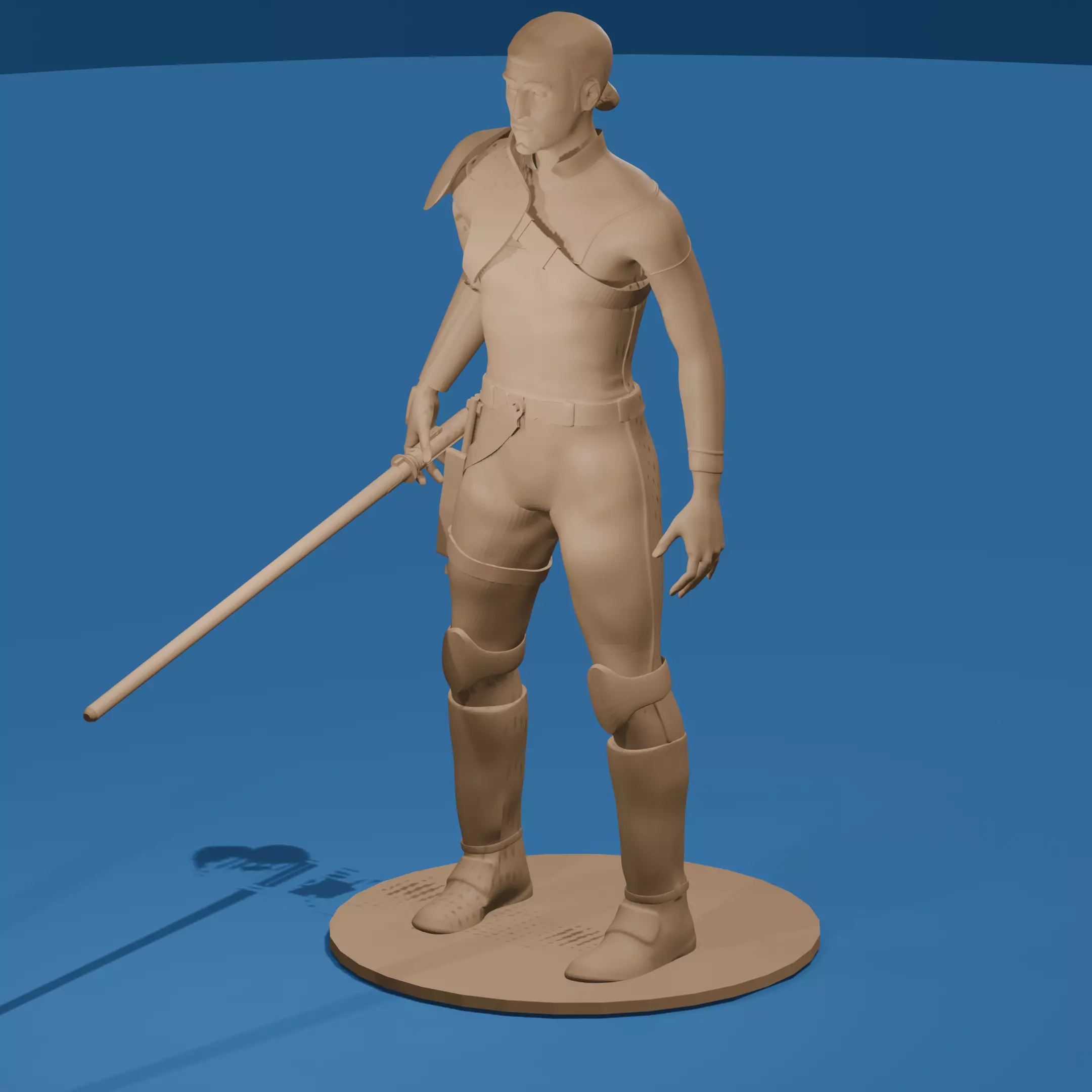 His outfit combines practicality with style: tight combat trousers, brown utility boots, a holster strap, and a ribbed shirt with a raised collar, evoking both sci-fi military and mystic traditions. The energy sword emits a soft blue glow, perfect for rendering dynamic lighting in scenes or prints.