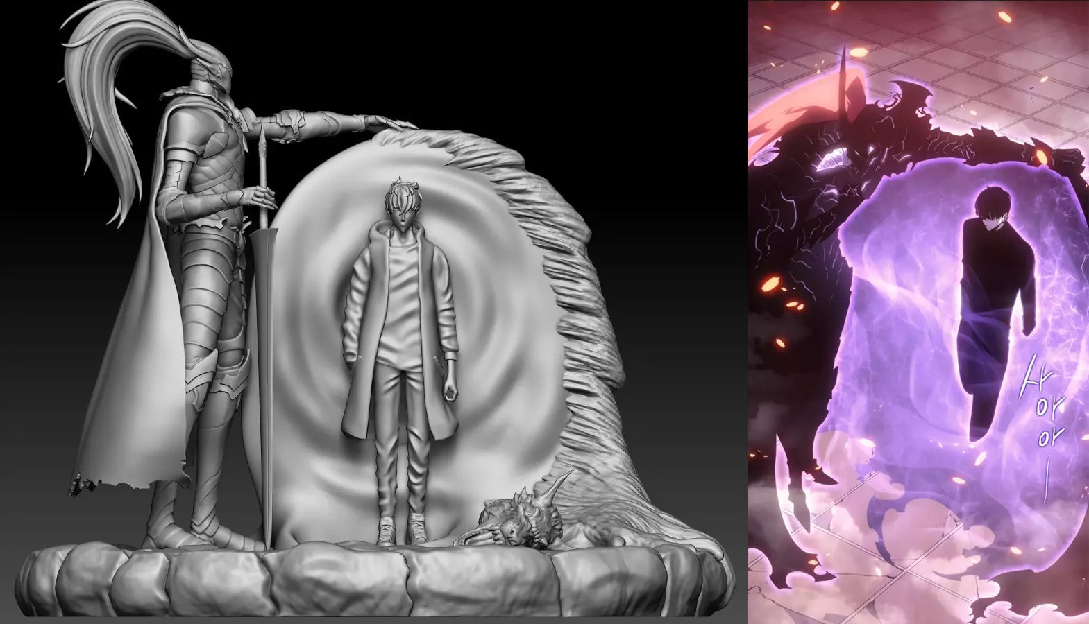 Here is diorama of the scene from solo leveling where sung jin woo is coming back from slaying the beast monarch. Igris that is making the portal and sung walking in front with the head of the monarch (wolf) laying at the ground.