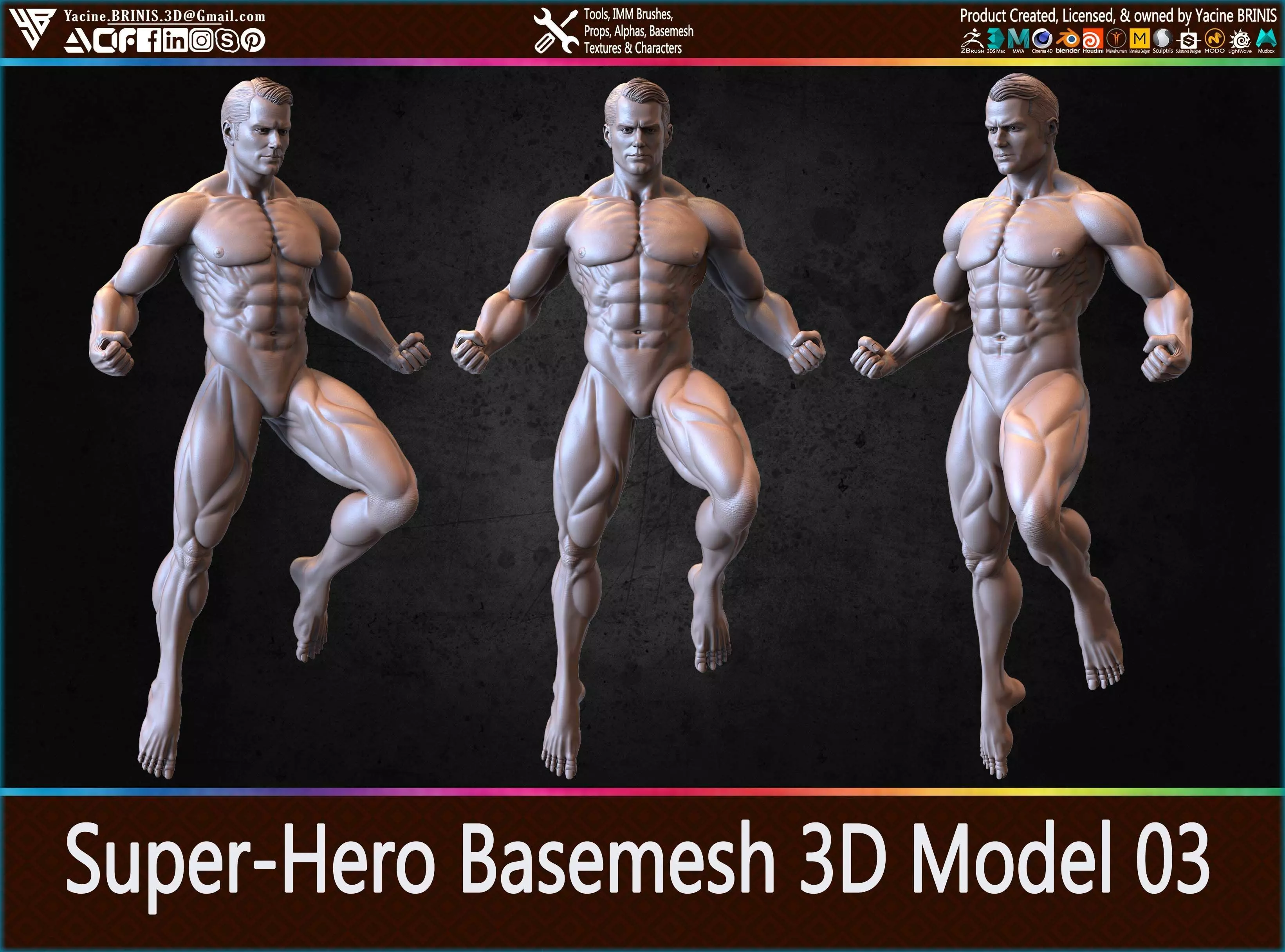 This is a Basemesh 3D Model of a superhero, sculpted with the iconic heroic pose reminiscent of Superman, and featuring the lifelike face of Henry Cavill from the Man of Steel and Batman v Superman movies. Sculpted with attention to detail using ZBrush, this model boasts highly detailed skin textures and realistic muscle anatomy, capturing the essence of strength and power.