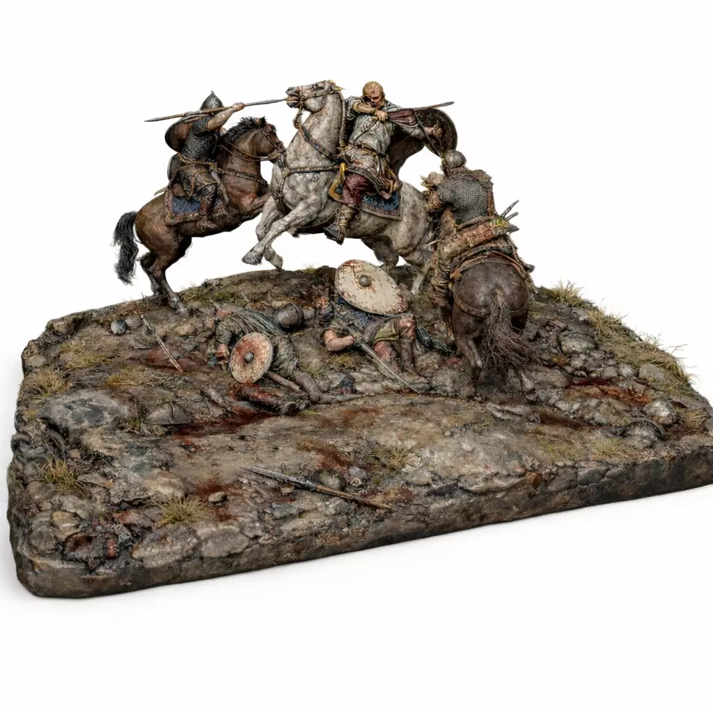 This dynamic scene captures an intense moment of medieval combat, featuring mounted warriors in a dramatic clash. Every element — from the horses’ movement to the fallen soldiers and battlefield textures — is sculpted with exceptional detail.