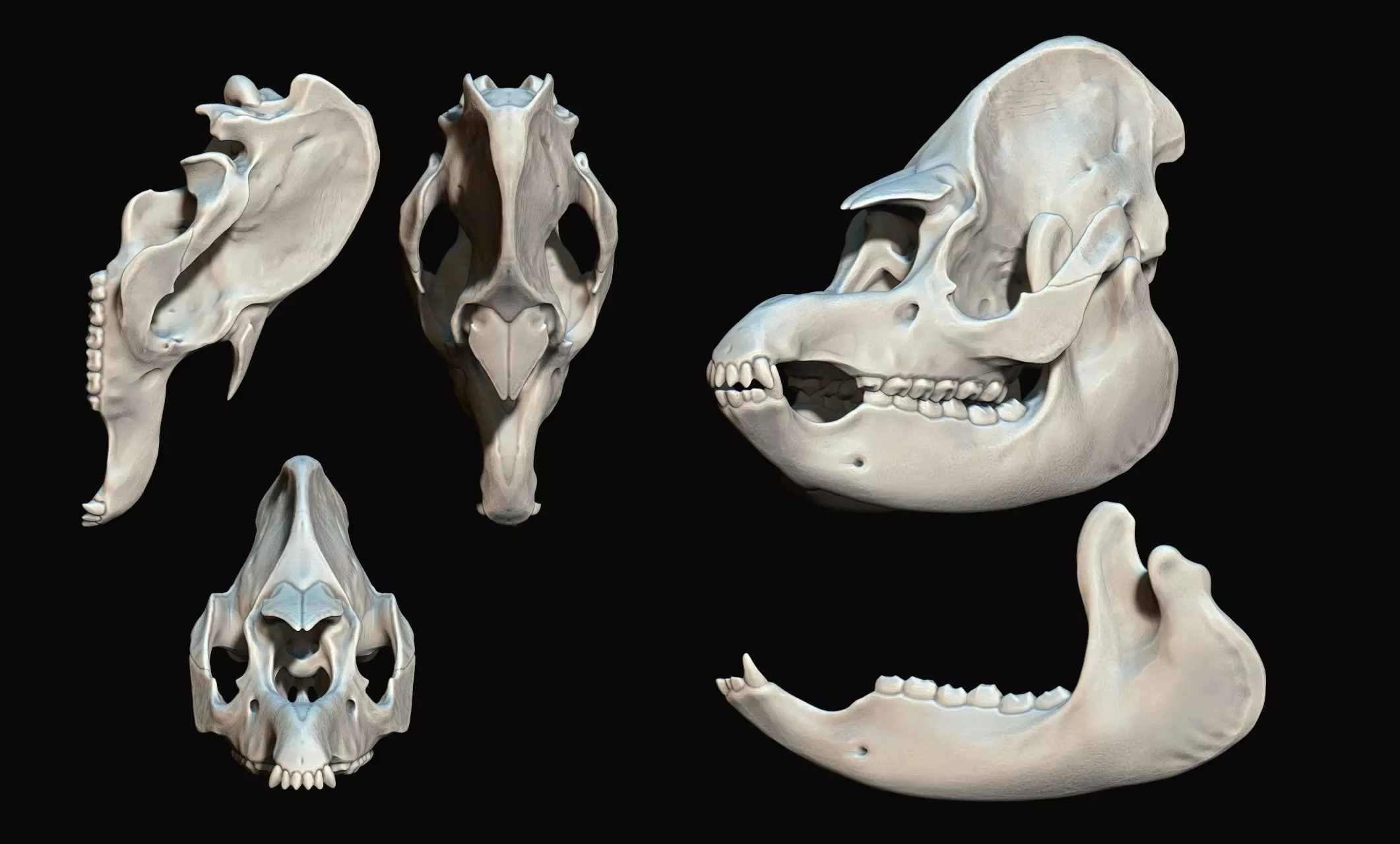 This model was created taking as a reference different images found on internet and a real scaned skull, included the most significant details especially in the most visible parts, the model has a measurement of 16cm in length and a high polygonal load to preserve the porosity of the bone itself.