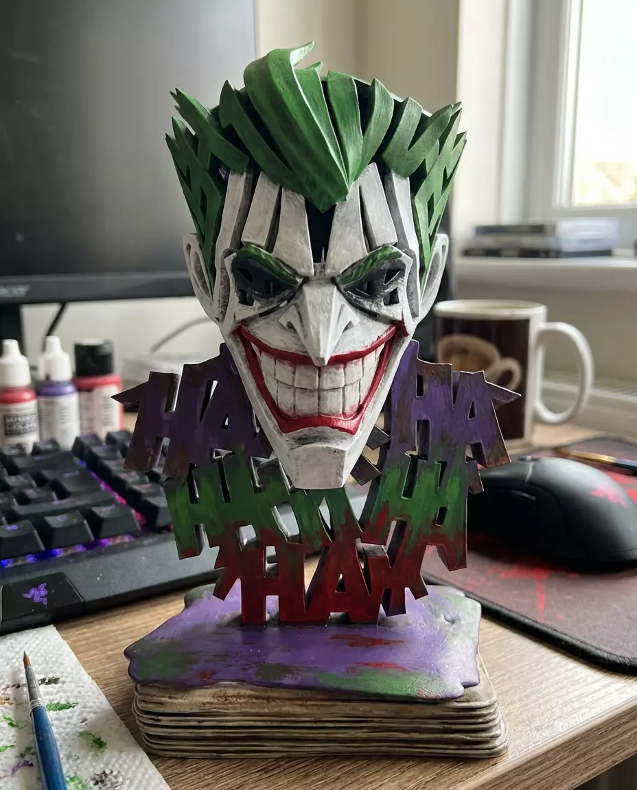 Why so serious? This stylized bust captures the Joker's manic energy with sharp, angular geometry and his iconic grin. The base is formed by his maniacal 'HAHA HAHA' laughter, making it a complete display piece. Perfect for Batman fans and collectors.