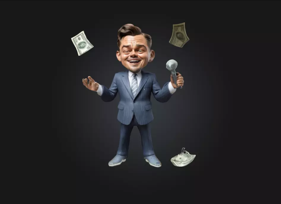 The model features DiCaprio standing atop a pile of sculpted dollar bills, with gold coins and tiny Wall Street ticker boards forming a unique backdrop. In his hand, he holds a microphone, symbolizing his iconic motivational speeches. Behind him, a miniature yacht and a small trading screen complete the immersive setting.