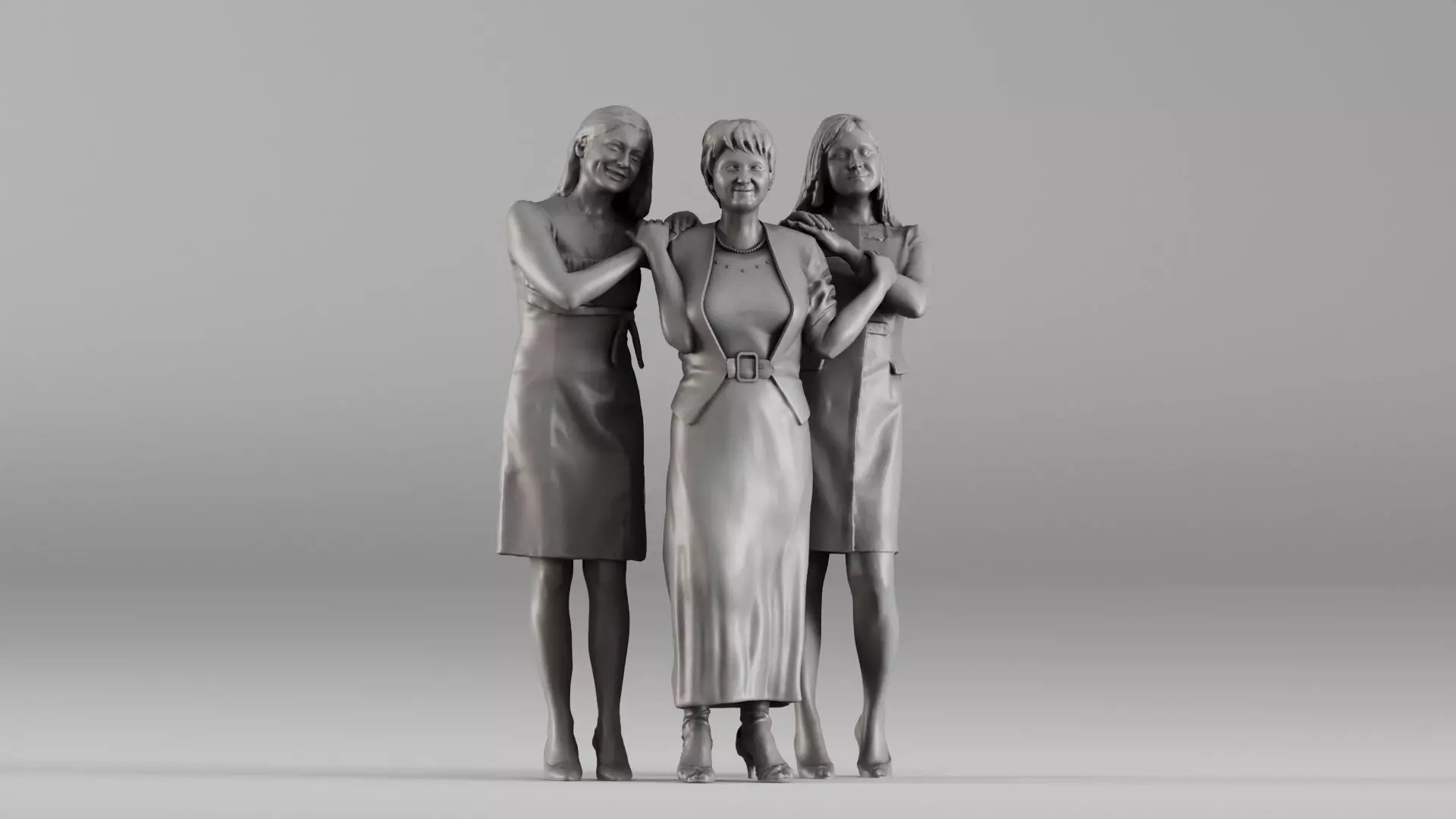 This real-human figurine set was created from accurate 3D scanning technology, ensuring lifelike proportions, realistic fabric detail, and natural emotional body language. The scene features three women standing closely and gently holding each other’s shoulders, symbolizing family unity, friendship, support, celebration, and emotional connection.