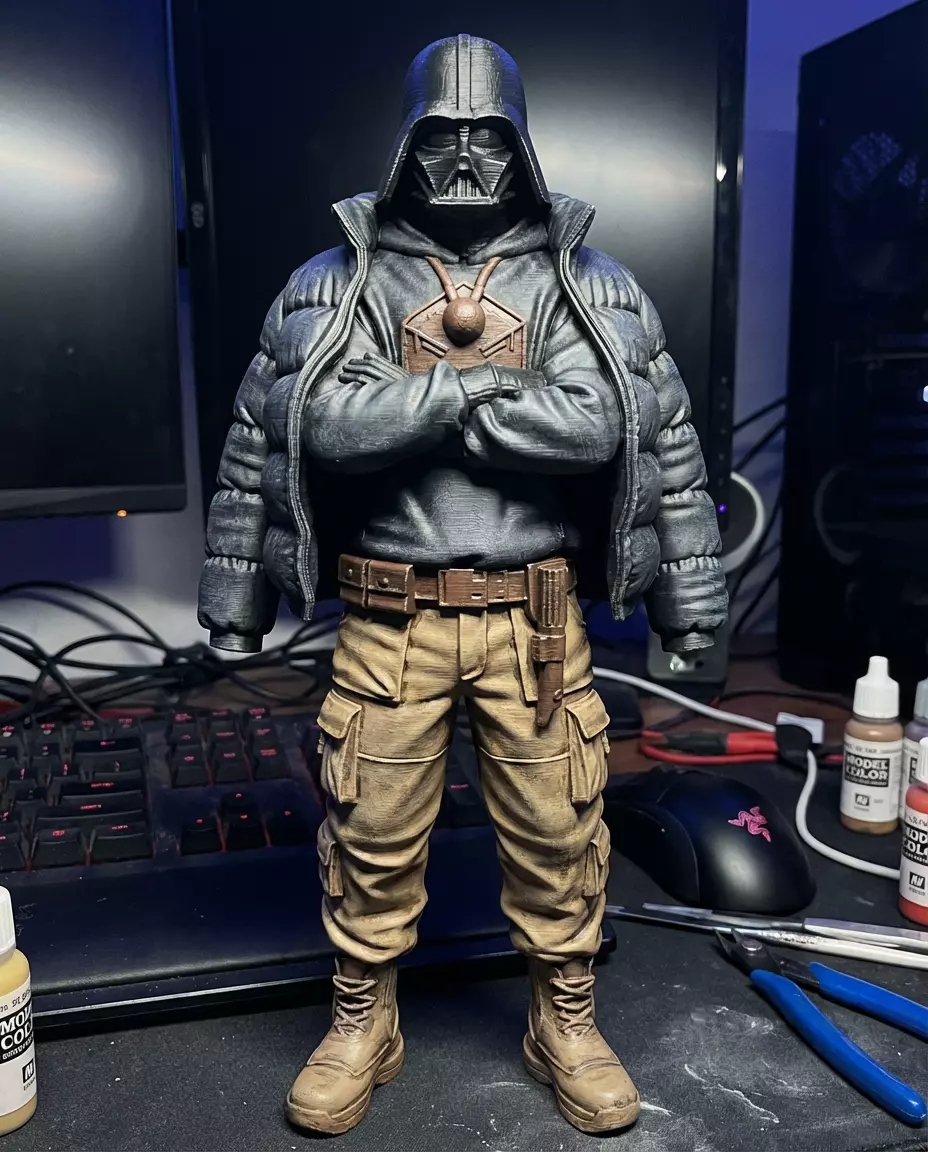 The Dark Side goes high-fashion. This 'Urban Vader' reimagines the iconic Sith Lord in modern streetwear, featuring a puffer jacket, cargo pants, and tactical boots. A bold, artistic crossover that’s perfect for hypebeasts and Star Wars fans who want something truly unique.