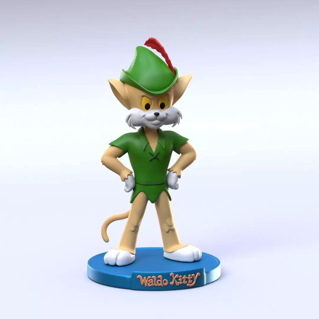 Steal the show with this Robin Cat edition of Waldo Kitty! This high-quality 3D miniature captures Waldo in his legendary outlaw persona, featuring his signature green tunic, pointed hat with a red feather, and heroic hands-on-hips pose.