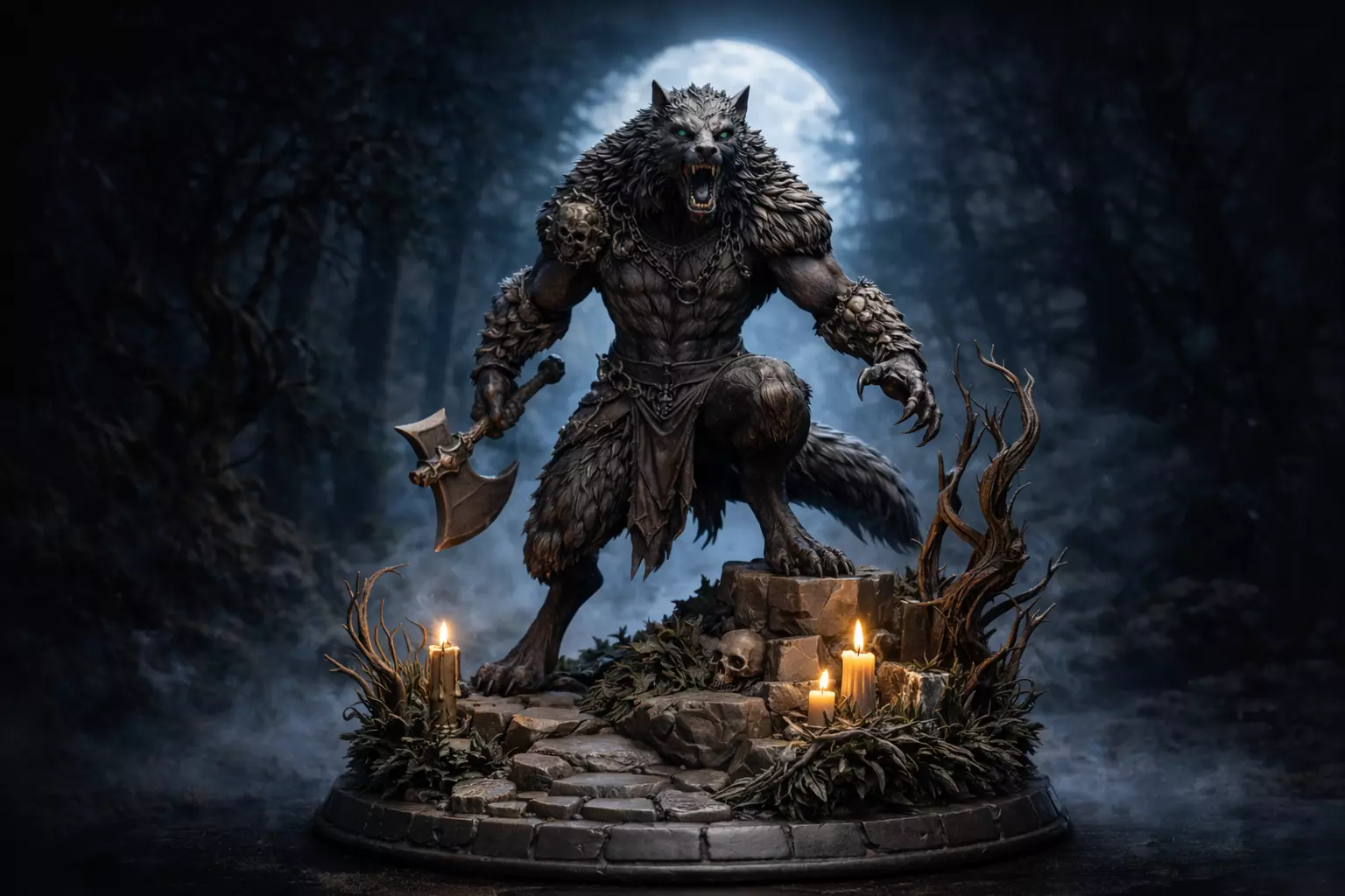 You are purchasing a high-quality STL model of a fierce Werewolf warrior — a brutal lycanthrope hunter standing on a detailed ritual stone base.