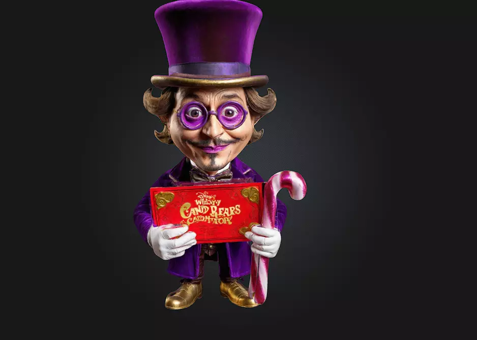 A quirky, stylized 3D caricature of Johnny Depp as Willy Wonka, complete with his signature top hat, colorful jacket, and quirky grin. The figure exaggerates his odd features, capturing his eccentricity and mystique. He holds a golden ticket in one hand and a candy cane in the other, ready to take you on a journey to the chocolate factory.